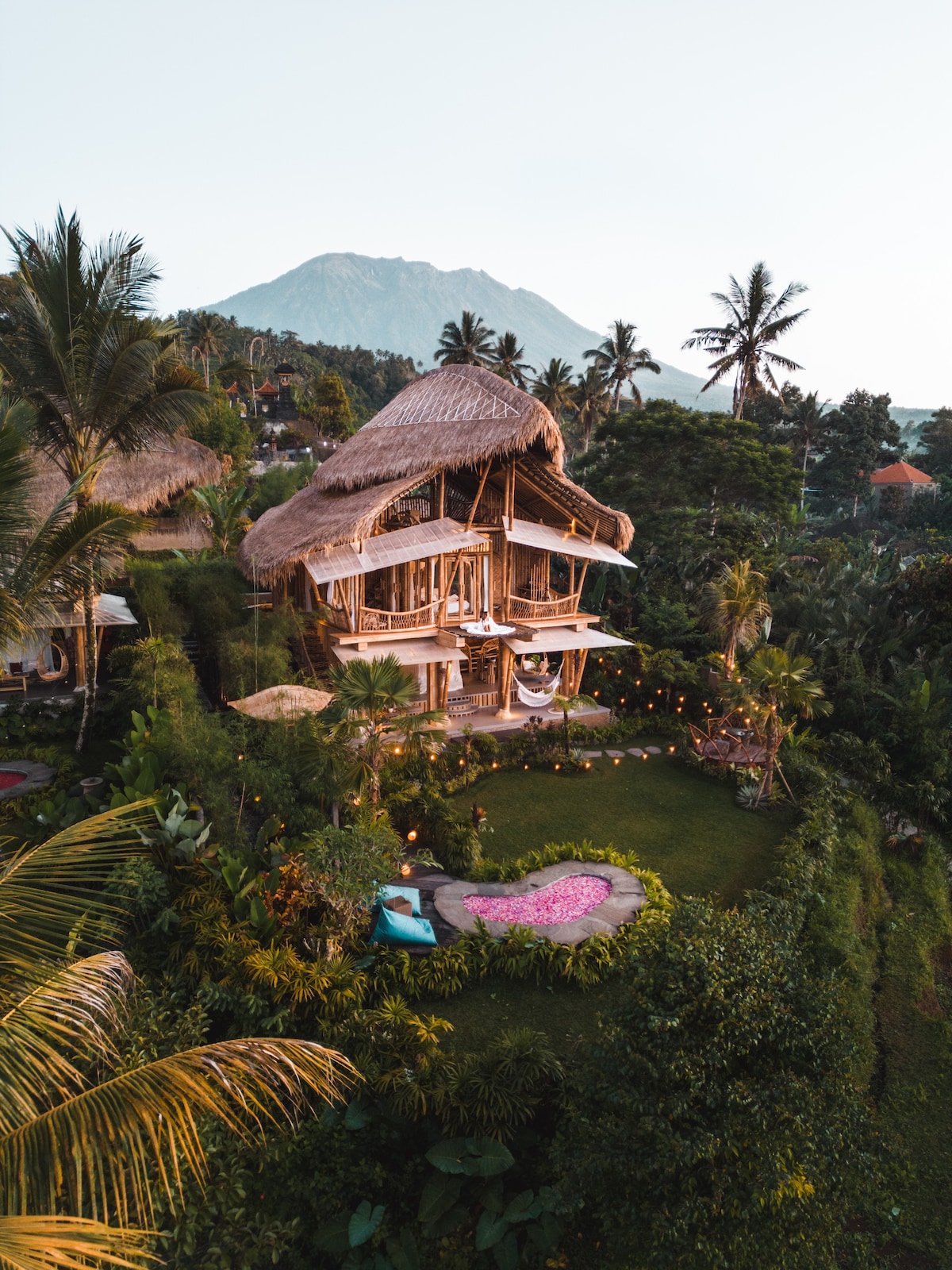 Alami Bali dari pemandangan mata burung di The Avana Treehouse Bamboo Villa. Pengalaman vila buluh sekali seumur hidup ini terletak 15 meter tinggi di antara pokok cengkih di pinggir tebing. Menikmati pemandangan dari mana-mana kawasan 3 tingkat akan meninggalkan anda berehat dan dengan sensasi anda terapung di udara. Di bawah Rumah Pokok Terapung adalah sawah padi yang luas dan subur di sepanjang Sungai Ayung yang bertemu gunung. Anda boleh melihat Gunung Agung Gunung Berapi di sebelah kiri dan Lautan Hindi di sebelah kanan.