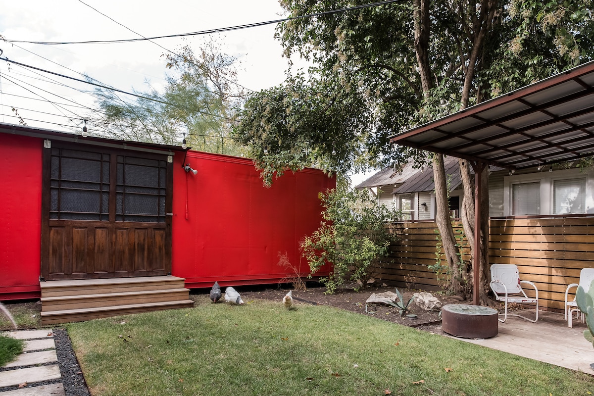 Walk through the bright red door (traditionally signaling a warm welcome) and enter a studio apartment with kitchenette, king bed, and full bath filled with art made by the owner and his friends. There is an Apple TV with multiple streaming options you can use your personal login for. The house is one block from shopping and dining on South Congress. On your visit you may meet our dog Chispa. She's very friendly and may greet you. Do not hesitate to let us know if she is bothe