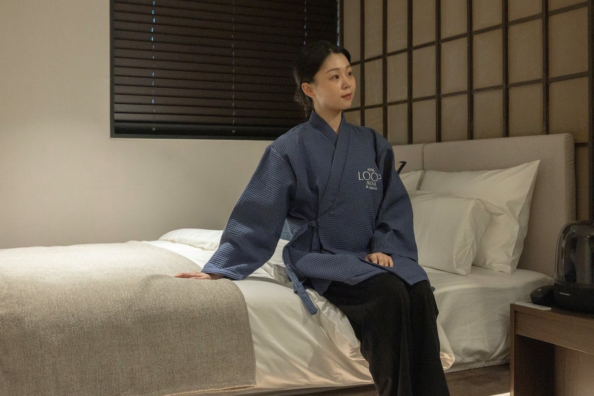 SEOUL Floor의 시그니처 스테이, 203–205 커넥티드 객실은 비밀스러운 히든도어로 연결된 두 개의 각 방이 여유로운 동선을 제공합니다. 205호에는 숙소를 상징하는 거대한 고재 테이블이, 203호에는 아름다운 대형 욕조가 자리합니다. ㅡㅡㅡㅡㅡㅡㅡㅡㅡㅡㅡ <ENTERTAINMENT> Each room features a smart TV with full access to OTT streaming services, seamlessly available without login. <ALL DAY LOUNGE> Our lounge offers a curated selection of complimentary light breakfast items—including fresh bakery, seasonal fruit, juice, milk, and premium coffee—available throughout the day.