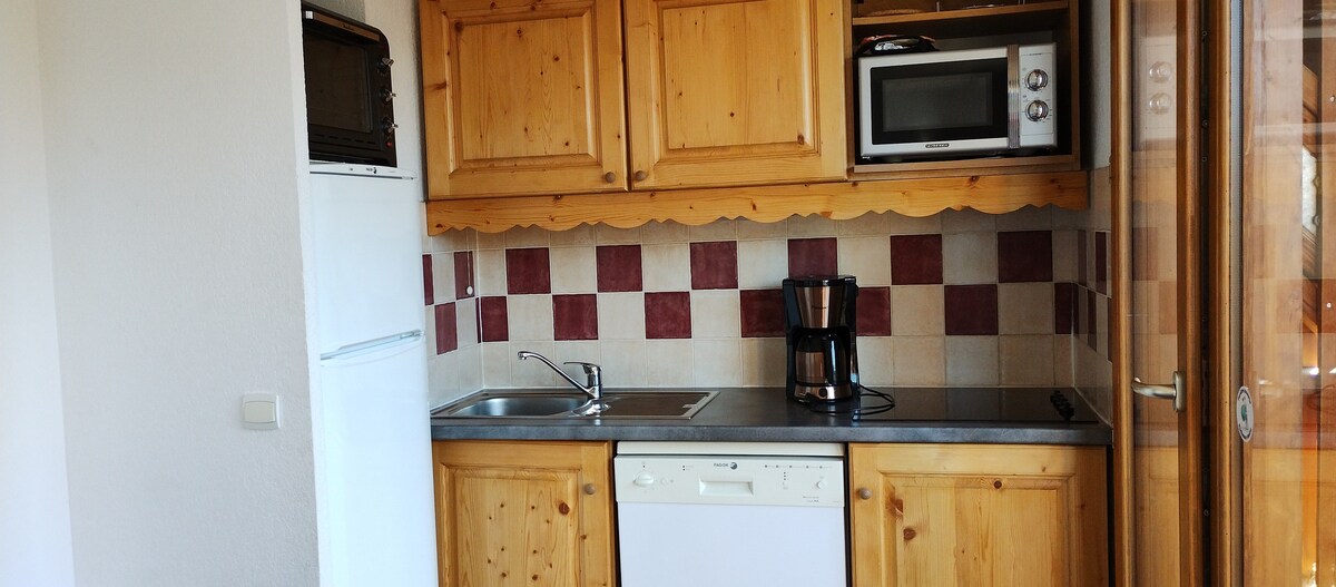 Nikmati penginapan tingkat 5 pusat yang bergaya dengan ski masuk dan ski keluar. Apartmen ini berhampiran dengan semua kemudahan dan mempunyai ruang letak kereta tertutup. Baru diubahsuai, ia termasuk 1 pintu masuk, 1 dapur terbuka di ruang tamu 1 bilik tidur double dan 1 bilik tidur kabin, bilik mandi dan tandas berasingan, balkoni menghadap selatan. Semua ruang tamu cerah dan mempunyai tingkap dengan pemandangan gunung atau lembah. Loker ski dan kolam renang di bangunan yang sama melengkapkan tawaran ini