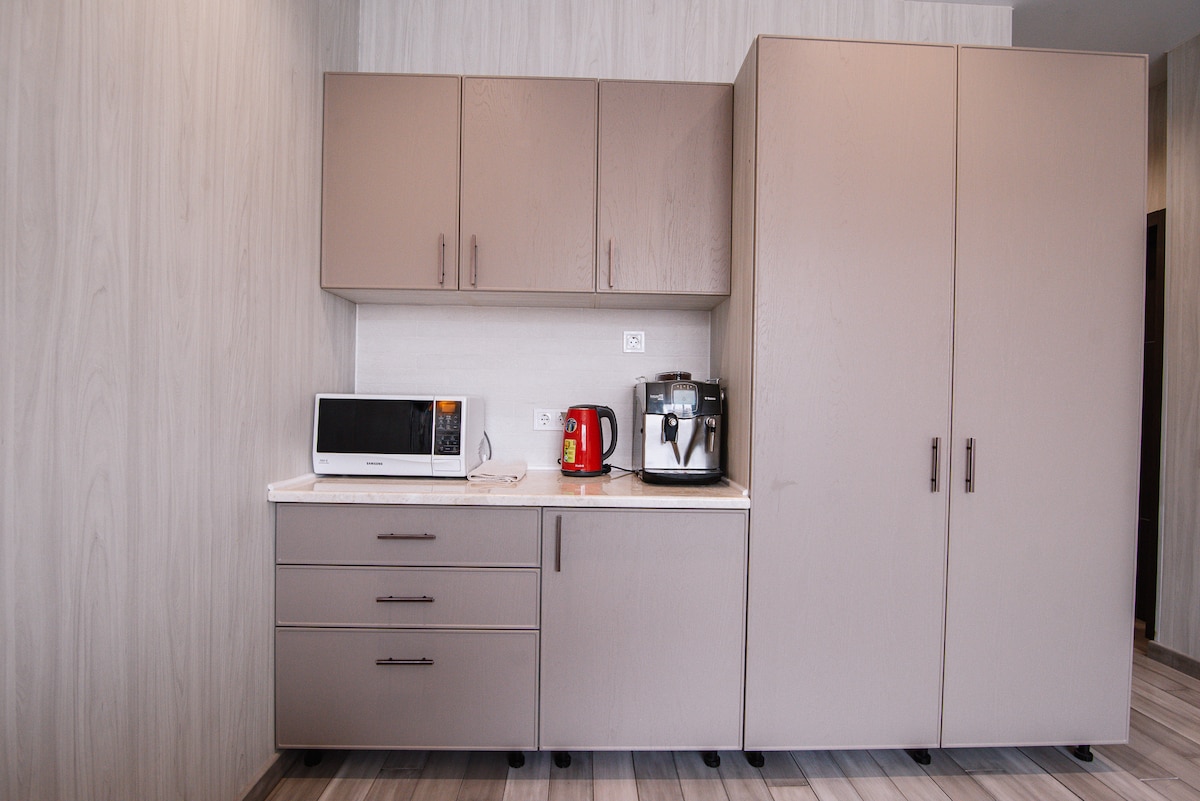 Stylish SPA suite in the heart of Kyiv, on Andriivskyi Descent. Panoramic windows with a view of the city, a spacious jacuzzi right in the room and a private sauna create an atmosphere of complete relaxation. Ideal for a romantic holiday, celebrations or special moments. A large bed, a modern interior and a kitchenette with everything you need for a comfortable stay. It's more than a number – it's an experience.