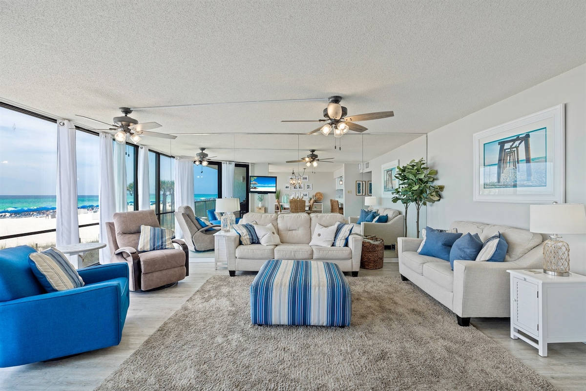 ** Kerusi pantai disediakan** Kondominium 2 bilik tidur 2 bilik mandi dengan sofa tarik keluar sesuai untuk keluarga & rakan-rakan. Terletak separuh jalan di tingkat 11 di Sterling Reef. Baru diubahsuai dengan pemandangan pantai zamrud yang menakjubkan. Ia sesuai untuk percutian singkat atau untuk percutian yang lebih panjang. Dengan semua kemudahan & akses pantai pantas di penginapan ini, anda tidak akan mahu keluar! Terletak kira-kira 3 batu dari Pier Park & jarak berjalan kaki ke Shipwreck Island terletak di pusat bandar untuk ke mana anda perlu pergi dengan cepat!