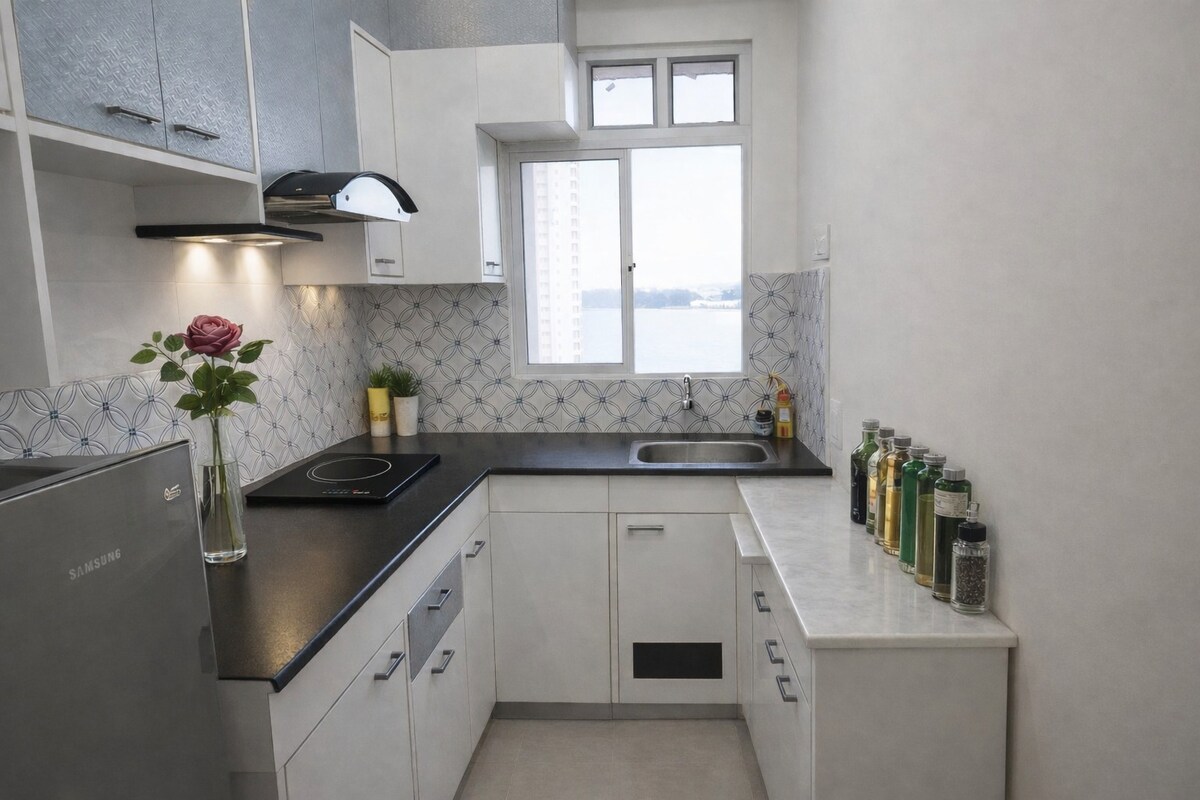 2BHK yang tenang di tingkat 4 dengan pemandangan balkoni kolam dan tumbuh-tumbuhan hijau. Menampilkan 2 bilik tidur AC dengan katil queen, bilik mandi dalam, dan tempat simpanan. Dapur lengkap, ruang tamu, katil sofa, TV Pintar 55” dengan aplikasi OTT, WiFi, permainan papan dan meja kerja. Bilik mandi bersih dengan keperluan asas, mesin basuh dan daftar masuk sendiri. Mesra haiwan peliharaan, peribadi, dan sesuai untuk keluarga, rakan-rakan, atau kerja jauh. Tiada ruang berkongsi.