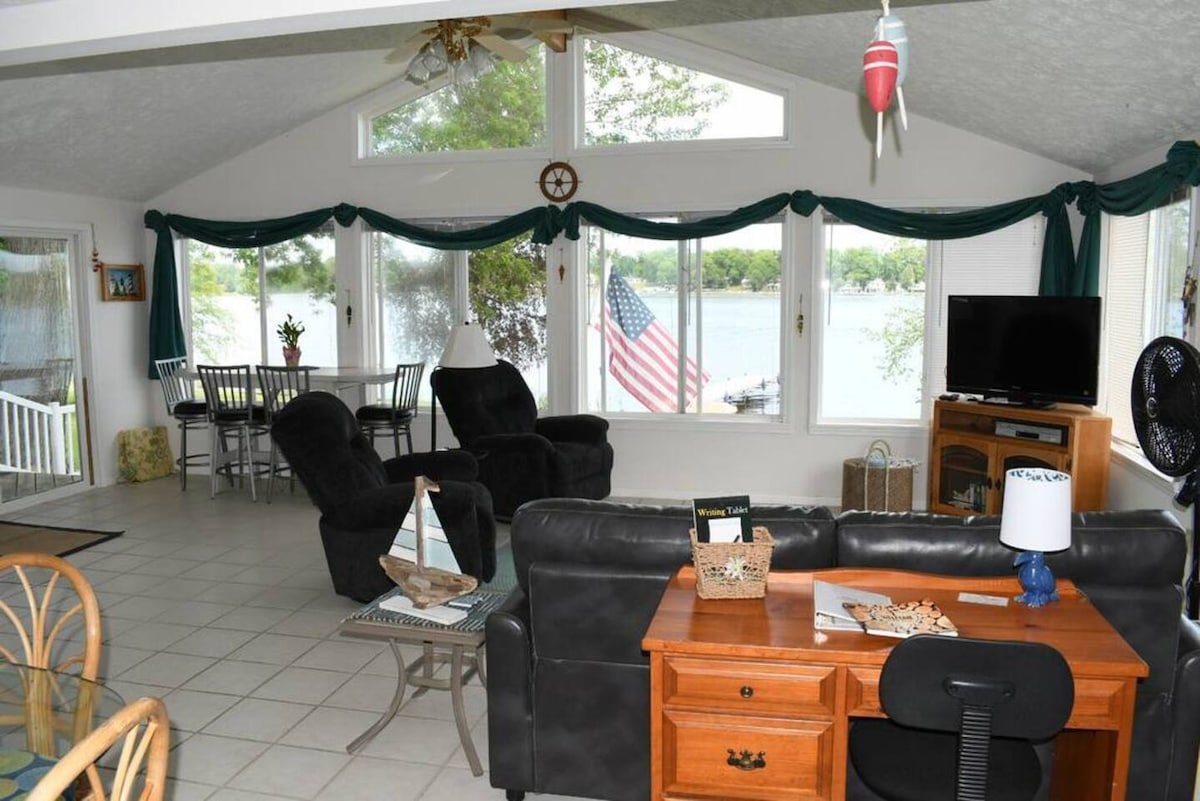 Percutian Kotej Tepi Tasik All Seasons -Tidur 7. Satu bilik mandi penuh dan pancuran mandi luar - Katil: 1 Queen, 1 Full, 2 Twins, Q Pullout sofa -120 kaki depan tasik persendirian dan berjalan di kawasan pantai - Halaman besar. Dek dengan meja/kerusi. Propane Grill. Firepit. Kayak & bot kayuh - Haiwan peliharaan & bot memerlukan kelulusan hos. Yuran haiwan peliharaan dan peraturan terpakai. - Kamera menghadap ke arah pintu hadapan untuk meningkatkan keselamatan dan ketenangan fikiran.