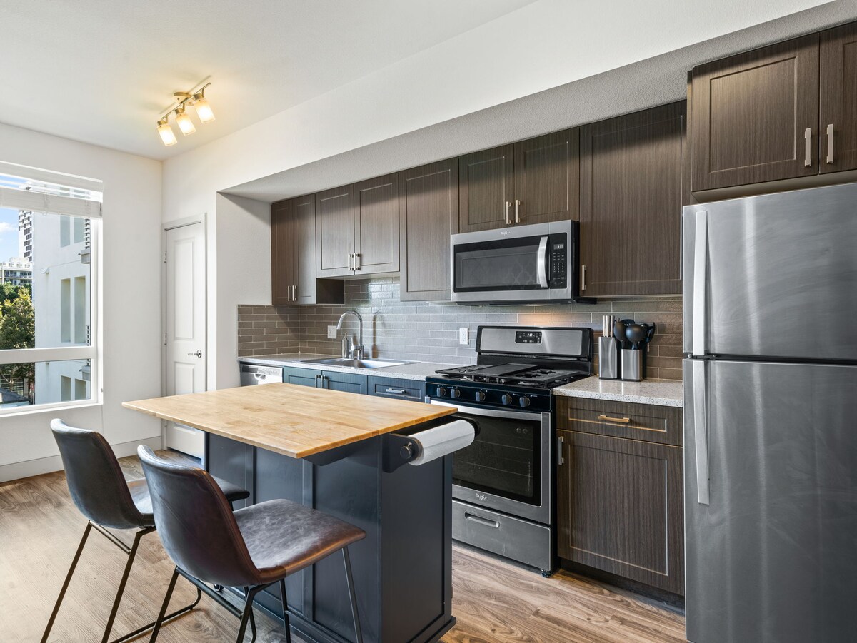 Loteng emper 1BR/1.5B (1,150 kaki persegi) yang cerah dan moden di pusat bandar SF. Tingkap besar, siling tinggi, dan banyak cahaya semula jadi. Nikmati dapur lengkap, TV OLED 77” di bilik tidur dan untuk malam wayang, projektor 120”, bunyi Sonos, dan pejabat rumah. Berjalan ke Giants Stadium, Yerba Buena Gardens, Union Square, Whole Foods, dan restoran terbaik. Termasuk tempat letak kereta tertutup/selamat! Tingkat atas, TIADA LIF — berbaloi menaiki tangga untuk pemandangan dan cahaya!