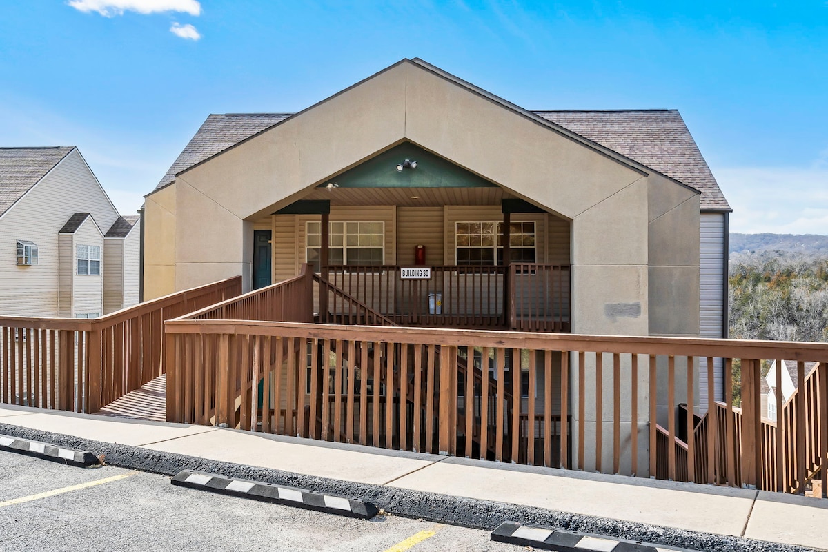 Moden, cerah, dan bebas tangga-kondo 2BR/2BA yang segar ini mempunyai dek sudut persendirian yang terasa seperti rumah pokok kecil anda sendiri. Dengan ruang dalaman kelabu dan putih yang menenangkan dan semua kemudahan resort (kolam renang & tab mandi air panas (keduanya bermusim - biasanya dibuka dari Memorial Day hingga Labor Day - sila tanya tarikh yang tepat), denai, dan banyak lagi), ia adalah tempat yang tenang untuk berehat antara pengembaraan Branson. Dapur lengkap, katil selesa, dan hanya beberapa minit dari Silver Dollar City.