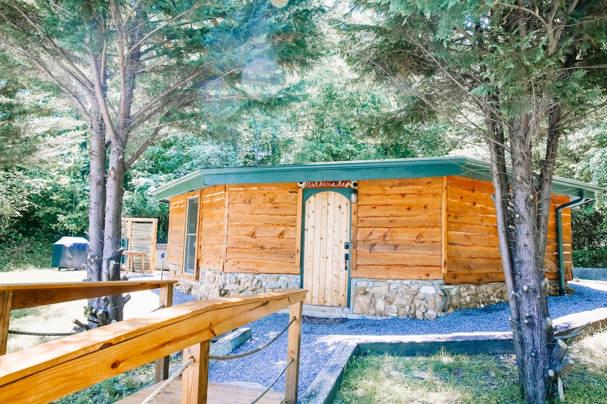Welcome to the Mothership, an octagonal post and beam cottage built for those with a love of the outdoor. Terletak di ladang kecil kami di kaki bukit Blue Ridge Mountains, kami adalah tempat pelancaran yang sempurna untuk pengembaraan. Lake James dan Linville Gorge hanya 20 minit jauhnya, Asheville 45 minit, dan Charlotte hanya sejam. Terokai banyak air terjun, berbatu-batu laluan, atau berkayak di sungai kami yang indah pada waktu siang, dan berehat di tab mandi air panas dan menembak kolam renang pada waktu petang.