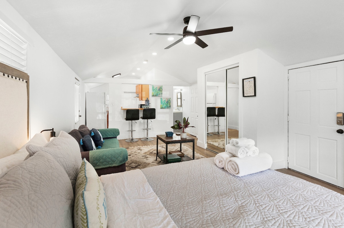 Percutian persendirian yang selesa di Lantana, yang diduduki oleh pemiliknya. Pintu Perancis terbuka kepada syurga tropika. Hanya 10 minit dari lapangan terbang, pantai, restoran, pusat konvensyen & membeli-belah. Nikmati bunyi alam semula jadi di dek peribadi anda yang terpencil oleh pokok palma. Termasuk A/C, bilik mandi, TV Pintar dan tempat letak kereta. PERHATIAN: Tidak mempunyai dapur yang lengkap, walau bagaimanapun, ia termasuk sinki, peti sejuk, ketuhar gelombang mikro, plat panas, dan peralatan untuk membaiki makanan ringkas dengan ruang kaunter yang luas! (lihat gambar) tiada DAPUR