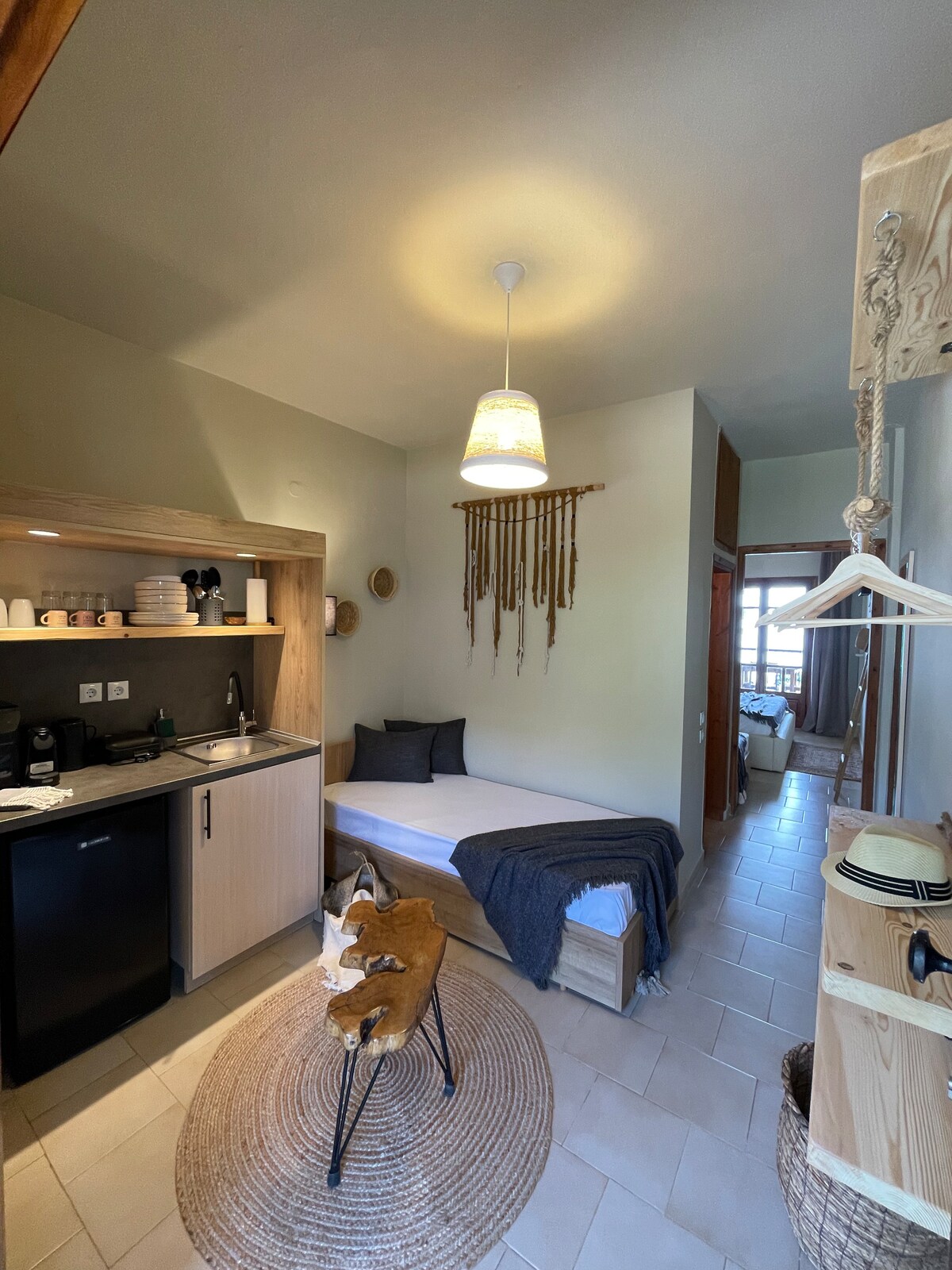 Στούντιο σε χωριστά επίπεδα,στο κεντρικότερο σημείο του Πευκοχωρίου, μόνο 70μ.από την παραλία. Ο κυρίως χώρος διαθέτει ένα διπλό κρεβάτι και όμορφη, πλήρως εξοπλισμένη κουζίνα. Μια μικρή σκάλα οδηγεί σε μια εσωτερική σοφίτα, όπου υπάρχουν 2 μονά κρεβάτια. Μεγάλη ιδιωτική βεράντα, όπου μπορείτε να πάρετε το πρωινό σας και όλα τα γεύματα της ημέρας. -Δωρεάν δυνατό Wi-Fi. -Κατόπιν αιτήματος, παρέχονται βρεφική κούνια, φούρνος μικροκυμάτων και σίδερο.