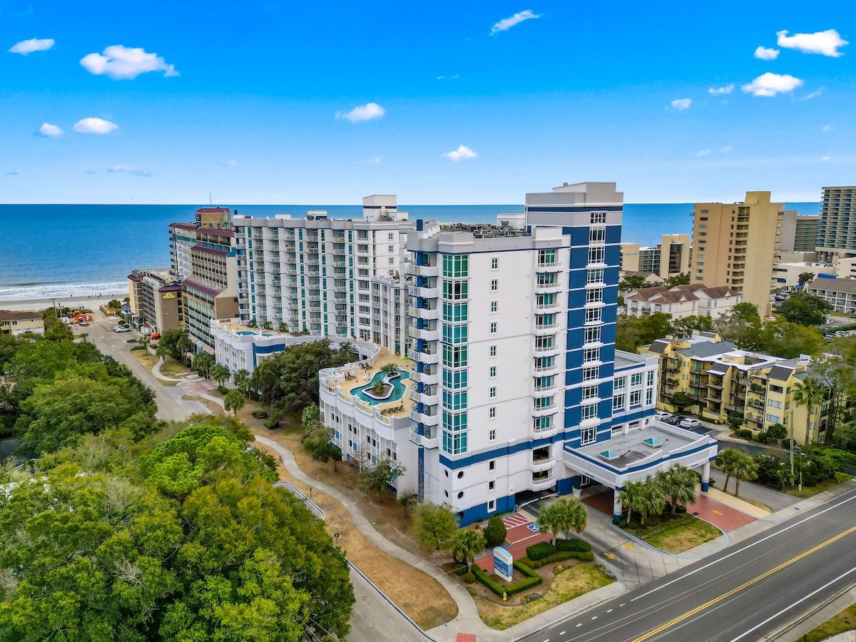 ༄THE BEST location: mere steps to the beach, walkable to the boardwalk, minutes to shops, restaurants + attractions ☼In a highly-regarded resort that's been voted Top Resort for 2 years in a row 𓇼Water attractions: Pools, Hot tubs, Lazy River, Kid's pool with pirate ship + Slides ☼Outdoor Shuffleboard, Cornhole, Giant Checkers + sun loungers 𓇼Equipped kitchen w/blender, coffee & waffle maker ༄ Board games, pack n play, high chair, beach chairs & toys ☼Walk to Starbucks 𓇼Smart TVs ༄King Bed
