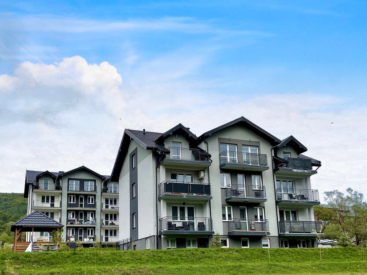 Dua rumah kayu yang menggabungkan gaya tempatan dengan kemodenan dan ciri-ciri luar bandar. Buka sepanjang tahun, setiap satunya dibahagikan kepada dua apartmen bebas (teres 48m2 +15m2), dengan pintu masuk berasingan, dapur kecil, ruang tamu, dua bilik tidur dan bilik mandi. Semua bilik tidur mempunyai balkoni yang menghadap persekitaran hutan beech yang indah atau panorama jauh Połonina. Terdapat sehingga dua taman permainan dengan trampolin untuk tetamu bongsu kami.