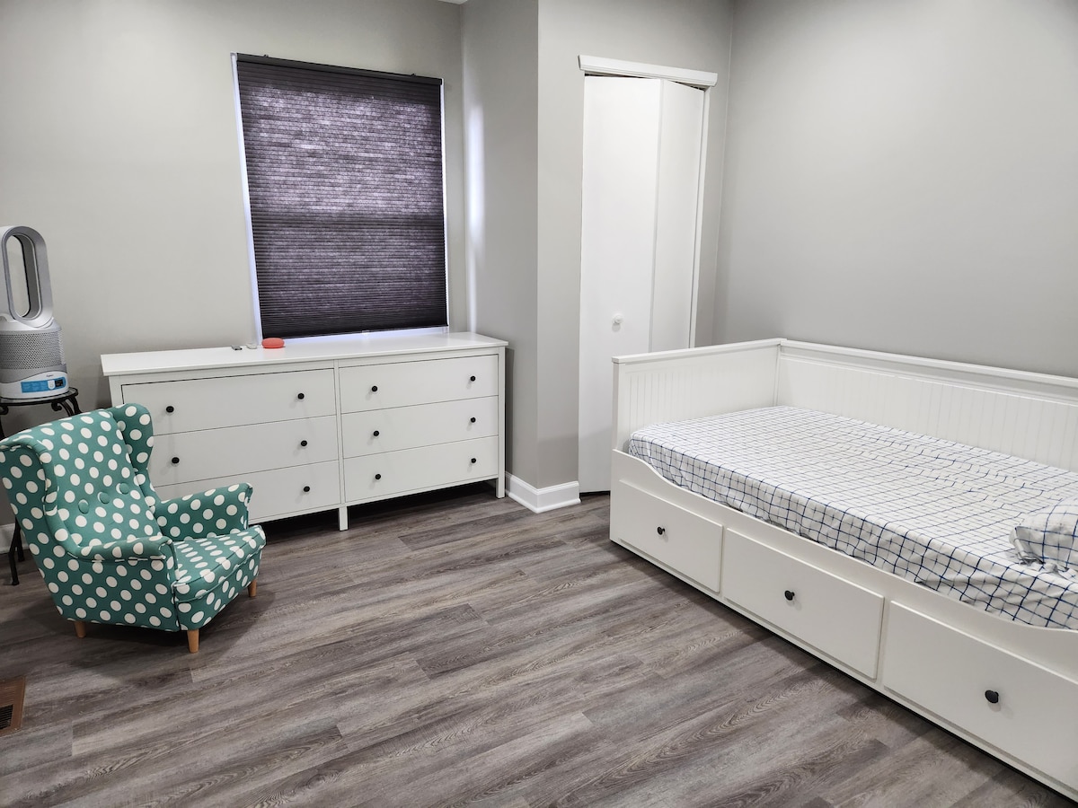 Keselesaan pintar mesra bajet dengan sentuhan hijau – Bilik kecil tetapi selesa ini mempunyai TV skrin besar dengan Roku, ottoman tarik keluar (bukan katil) yang bertukar menjadi katil kecil yang selesa sedikit lebih kecil daripada katil kelamin standard, meja, & kerusi malas untuk berehat atau bekerja dengan selesa. Terletak di tingkat 2 rumah bandar yang tenang berhampiran kedai & kedai runcit, dengan akses pantas ke Laluan 78 & 22, ia kurang daripada 2 batu dari kereta api NYC & 25 minit memandu dari Lapangan Terbang Newark. Tempat letak kereta percuma di hadapan unit.