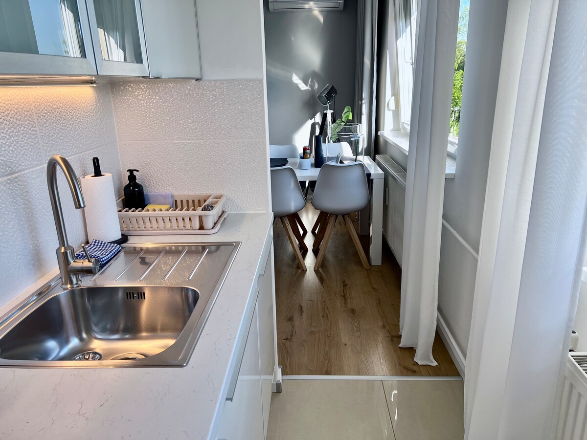 Newly renovated in 2025. Floor heating. Ideal for 4, comfortable for 6. It is a ground floor apartment (55m2) with its own entrance. It has free private parking, high speed WIFI&TV, washer/dryer, fully equipped kitchen, two bedrooms with King size beds (180x200), living room with a sofa/double bed , a bathroom with shower & terrace with table and chairs. It is located in a quiet neighborhood - Hofer/Aldi is 600m away, bus directly linked to city center 300m . 5min or 3km to city center by car.