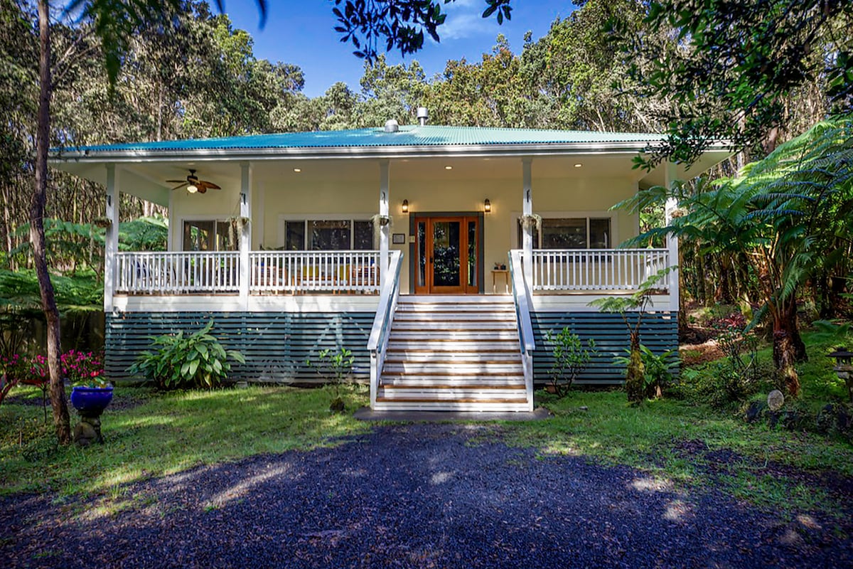 Dengan siling yang tinggi, banyak tingkap dan dikelilingi oleh hutan hujan yang subur, Hale Mauka adalah tempat percutian luar bandar anda yang sempurna di Gunung Berapi, Hawaii di Pulau Besar. Kami hanya 5 minit memandu ke Taman Negara Gunung Berapi dan Kampung Gunung Berapi. E komo mai!