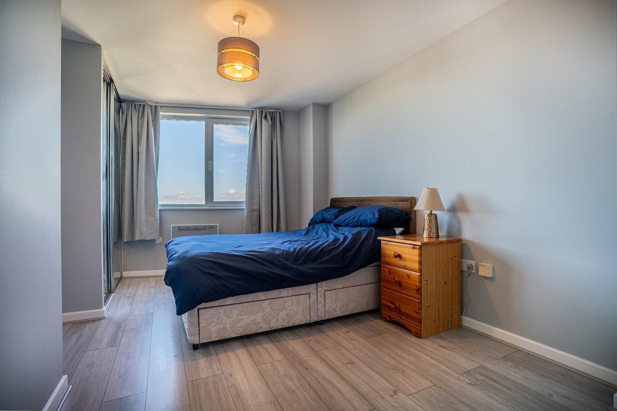 Enjoy a stay at this stylish, centrally-located 2 bedroom, 2 bathroom flat in the heart of Chelmsford, with parking and large windows to enjoy the views. It is furnished with all you need to feel at home - whether you are a family or contractors. It is about a 5 min walk to the city centre, access to Chelmsford train station, bustop, and the motorway. Long Stay discounts available