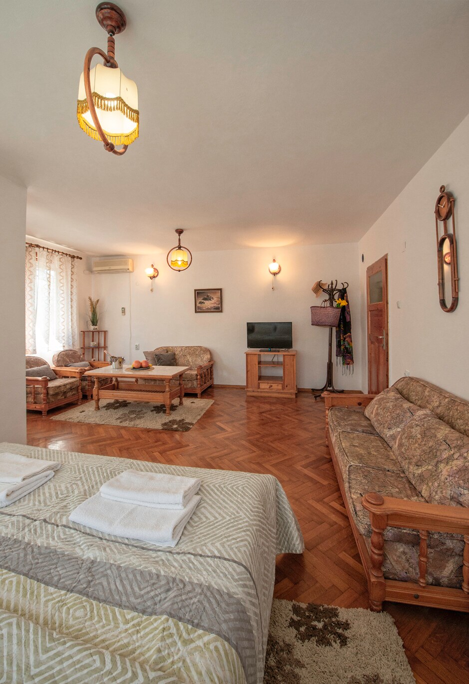 Ada ruang yang cukup untuk semua orang. Sesuai untuk keluarga besar dengan kanak-kanak. 2 bilik tidur dan ruang tamu yang luas. Balkoni besar di mana anda boleh meletakkan kerusi berjemur dan berjemur. Dapur, 3 bilik mandi (2 bilik mandi penuh dengan tandas dan 1 tandas tetamu). Wi-Fi dan TV kabel. Kompleks ini mempunyai kolam renang kanak-kanak dan dewasa, serta gelongsor air. PENTING: Bermula dari Julai 2025, akses kepada kolam renang tertakluk kepada yuran tambahan – €10 seorang sehari.