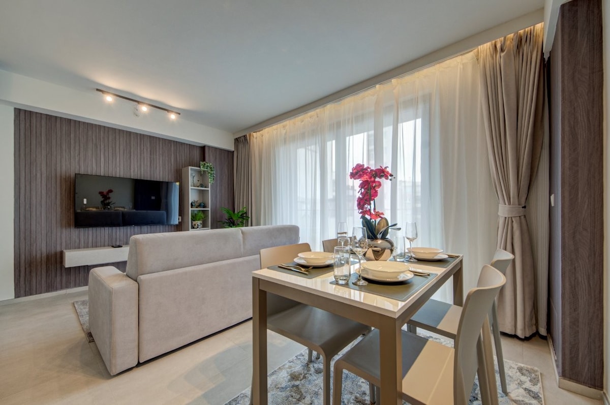 Apartmen moden dan cerah Alami kehidupan mewah di langit di tingkat 25 Menara Mercury. Sesuai untuk 2 tetamu. Nikmati kopi pagi atau wain petang di balkoni persendirian dengan pemandangan yang menakjubkan. Dilengkapkan sepenuhnya dengan bilik tidur yang selesa, ruang tamu bergaya, dapur lengkap. Sesuai untuk penginapan romantik atau perjalanan perniagaan. Tepat di tengah-tengah St. Julians berhampiran kedai, restoran dan hiburan malam.