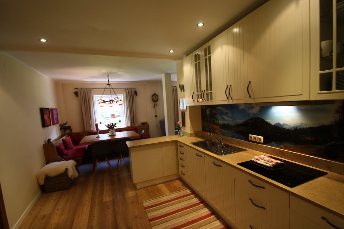 Anda boleh menyewa rumah percutian kami yang selesa dengan kombinasi dapur & ruang tamu moden, 2 bilik tidur berasingan dan dua balkoni besar. Flat ini berada di tingkat satu inap sarapan kami dan rumah ini dikelilingi oleh gunung. Harga dikira berdasarkan katering sendiri, yang mudah di dapur lengkap (mesin basuh pinggan, pembakar roti, mesin kopi, ketuhar gelombang mikro dll.). Kelengkapan bayi adalah percuma dan untuk kanak-kanak terdapat permainan dan mainan, di dalam dan di luar.