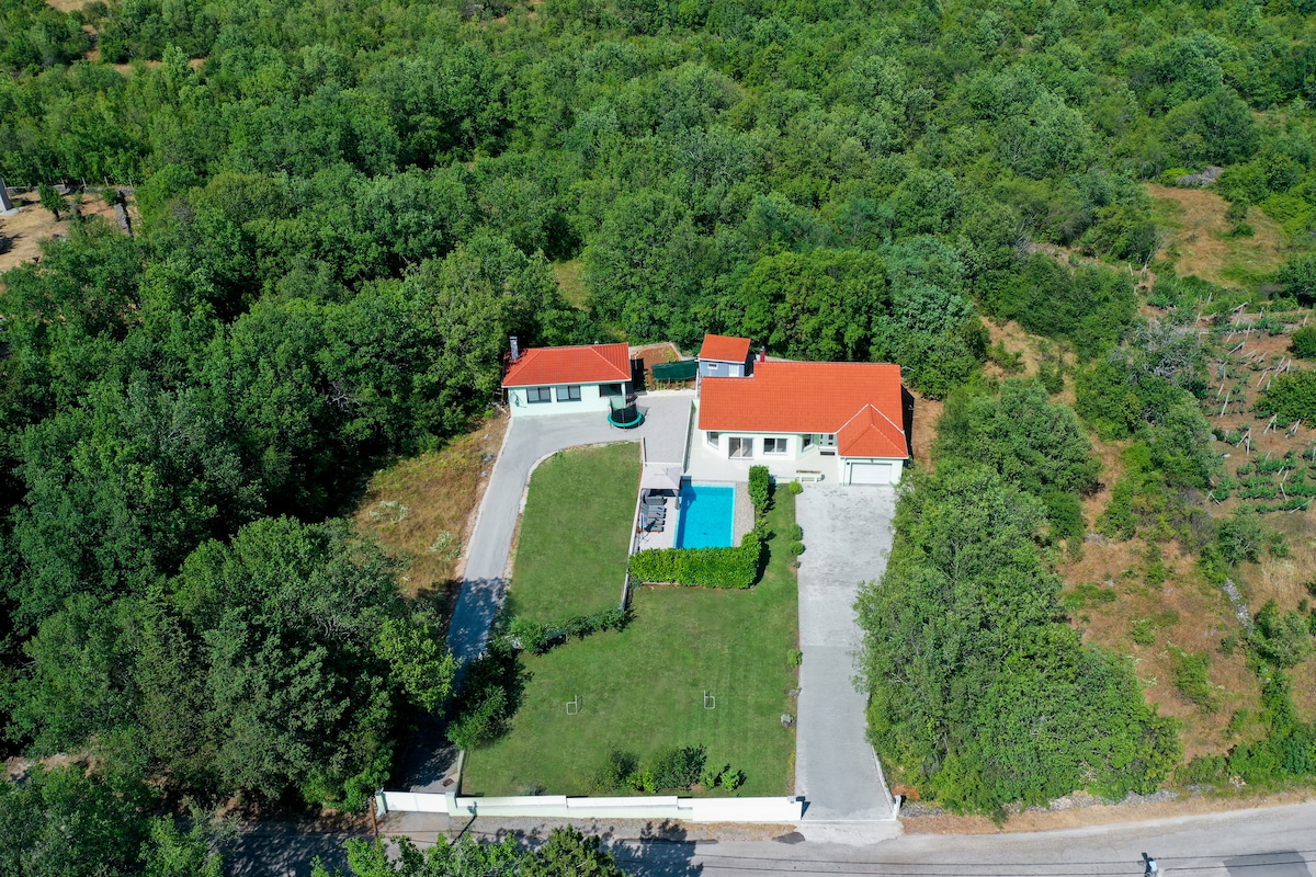 Rumah baru yang dibina pada Jun 2022 ini menyeronokkan untuk dilihat! Ia memuatkan 5 orang dan menawarkan kolam renang seluas 25 meter persegi dan jakuzi. Anda boleh berbangga dengan kemahiran BBQ anda di teres luar; atau menunjukkan kepada dunia betapa bagusnya anda bermain FIFA di PS5 di dalam rumah. Untuk malam yang hujan - kami syorkan Netflix dan bersantai di TV 65”kami. Terletak di kejiranan yang tenang 20 minit memandu dari kesibukan Split. Adakah anda bersedia untuk menjadi tetamu pertama kami?