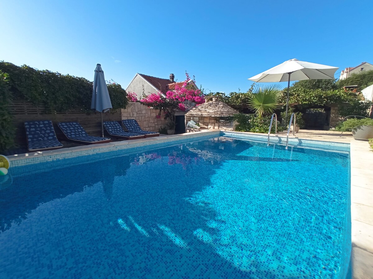Kuća s bazenom i vrtom. Ima 3 spavaće sobe sa pripadajućim kupaonicama. Vanjski prostor sadrži kuhinju, privatni bazen i prostor za boravak . Treća spavaća soba je na gornjoj etaži s natkrivenom terasom i pogledom na more. / The house with a pool and a garden. It has 3 bedrooms (every has a bathroom). The garden has an outdoor kitchen, private pool and places to eat and hang out. The third bedroom is on the other floor with a baby bed, 3 beds and a terrace looking at the seaside.