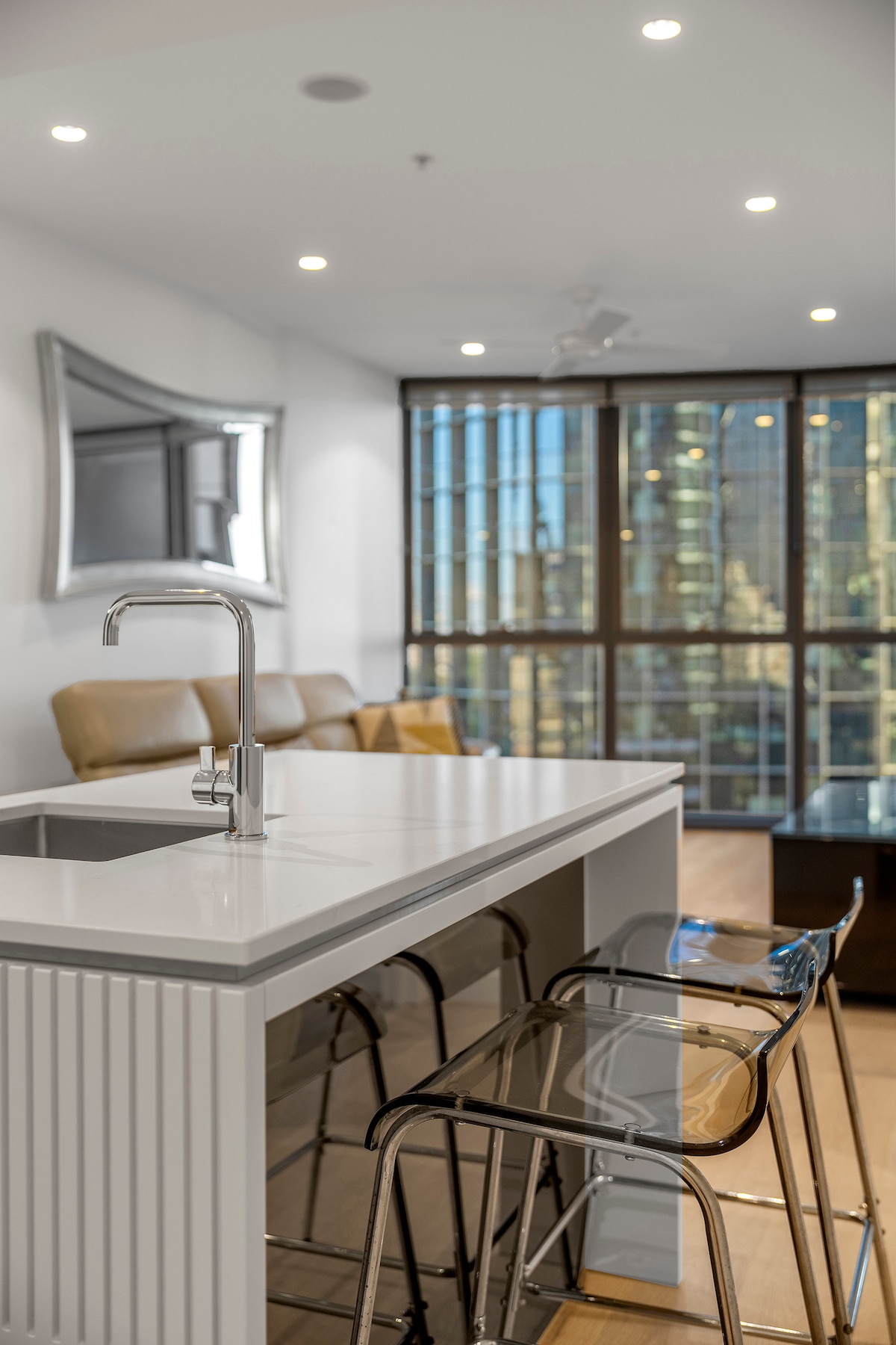 Tinggikan diri di atas bandar dan bersantai dalam kemewahan yang tenang dan tinggi di New Queen's Wharf. Terletak di tingkat 59, apartmen baharu yang direka dengan indah ini menggabungkan hiasan dalaman yang menenangkan yang diilhamkan oleh alam semula jadi dengan pemandangan latar langit, sungai dan gunung Brisbane yang menakjubkan dan tidak terganggu. Masuk ke ruang yang tenang di mana nada tanah lembut, tekstur semula jadi, dan kemasan mewah mewujudkan percutian yang sempurna—sama ada anda berada di sini untuk perniagaan, percutian romantis, atau percutian damai di tengah-tengah bandar.