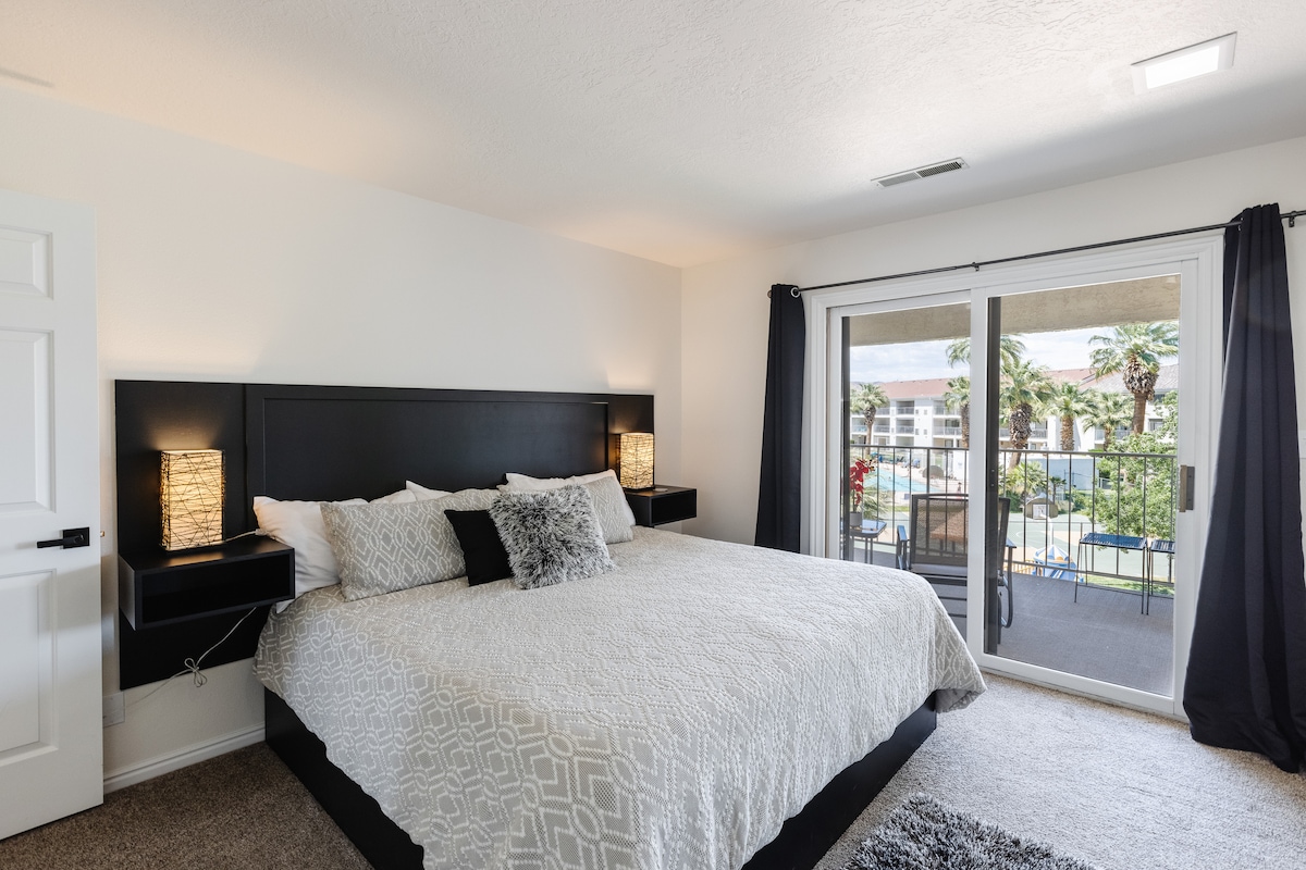 Kondominium cantik di St. George! 3 bilik tidur dan 3 bilik mandi. Boleh memuatkan hingga 10 tetamu. Balkoni menghadap tab mandi air panas dan kolam renang, serta gelanggang bola keranjang dan acar bola. Bola keranjang, dayung pickleball dan bola, dan permainan papan boleh didapati di kondominium untuk kegunaan anda. Kami suka berada di tingkat 3 untuk pemandangan dan kerana kami boleh menyimpan basikal kami dengan mudah di balkoni. Terdapat laluan berbasikal yang menakjubkan di seluruh tempat, dengan akses kepada denai Bearclaw Poppy (kegemaran peribadi kami) di seberang jalan!