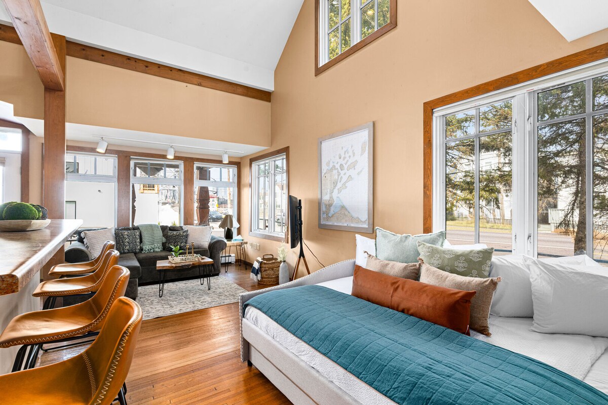 Enger Lofts Hotel is your adventure-town getaway in the heart of the Craft District of Duluth, this hotel is right next door to plethora of breweries and restaurants. Remodeled in 2020, this 1800s era warehouse features a modern kitchen, soaring ceilings, & large windows inside an airy, cozy studio.