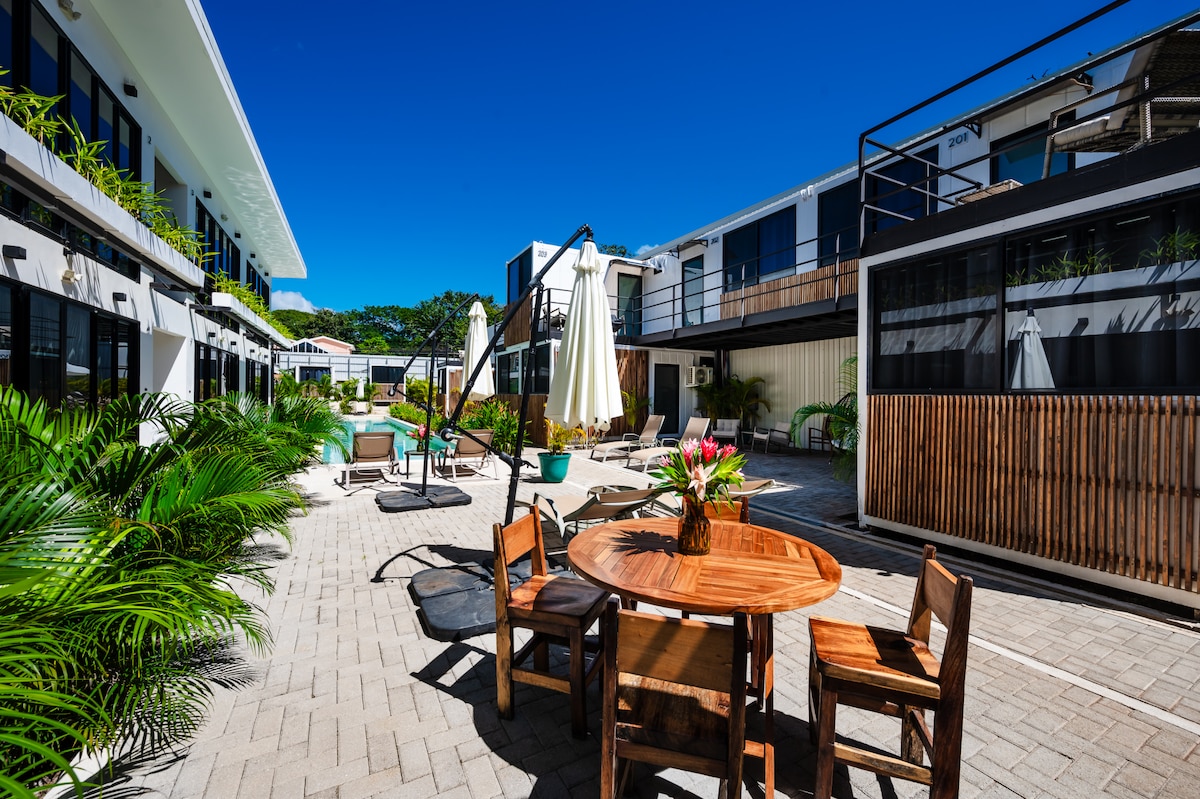 Larikan diri ke studio gaya Scandinavia unik kami, khusus untuk orang dewasa, yang dicipta daripada kontena perkapalan moden. Sesuai untuk 2 orang, percutian yang tenang ini menampilkan katil king, dapur kecil, dan Wi-Fi berkelajuan tinggi. Bersantai di tepi kolam renang berkongsi di oasis tropika kami, hanya 2 minit berjalan kaki dari pusat bandar yang meriah. Percutian yang bergaya dan damai menanti.