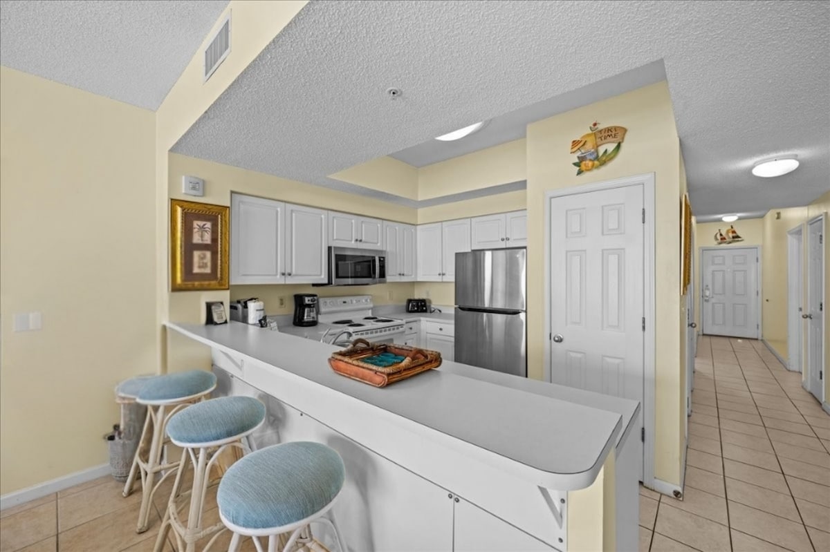 Nikmati pemandangan laut penuh dari balkoni tingkat 4 ini. Satu bilik tidur ini, satu setengah bilik mandi dengan katil dua tingkat, adalah tempat yang sesuai untuk percutian pantai anda. Unit ini mempunyai semua yang anda perlukan, termasuk mesin basuh dan pengering. Nikmati 3 minit berjalan kaki singkat ke pantai, restoran berhampiran, membeli-belah dan kolam renang besar yang dipanaskan. Destinasi ini tidak akan mengecewakan! Kemudahan di tapak termasuk: Cabana Cafe (bar & restoran) Kolam renang panas Akses pantai Gimnasium Golf Tenis Bola Keranjang Dan banyak lagi!