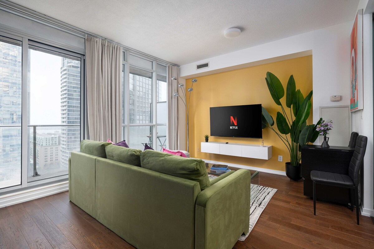 Stay in the heart of downtown Toronto in this modern one-bedroom condo just steps from the CN Tower, Rogers Centre, and the waterfront. The unit features a comfortable queen bed in the bedroom and a sofa bed in the living room, perfect for couples or small groups. Enjoy skyline views through floor-to-ceiling windows or relax on the private balcony. The condo includes a full kitchen, smart TV, high-speed Wi-Fi, and in-suite washer and dryer. Guests also have access to a gym and outdoor pool .