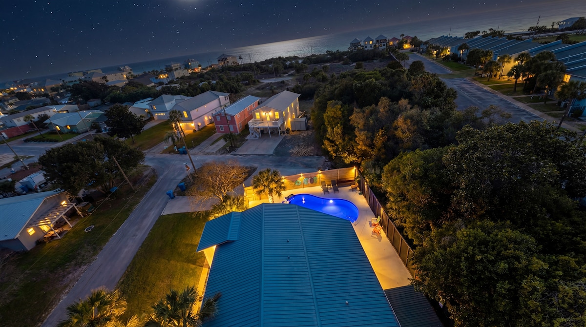 Selamat datang ke percutian pantai yang santai ini. Anda akan menikmati kolam renang, patio tertutup untuk memanggang, dan menikmati pemandangan matahari terbenam di dek tingkat atas. Rumah ini boleh memuatkan sembilan orang, mempunyai dapur baharu, ruang keluarga untuk bersantai, dan internet pantas untuk bekerja atau menstrim filem. Anda akan berada hanya sepuluh minit berjalan kaki ke pantai, dan pemanduan singkat dari 30A dan Pier Park. Kami mesra anjing dengan bayaran yuran haiwan peliharaan sebanyak $ 170. Maksimum tiga anjing. Pemanasan kolam renang tersedia pada harga $ 40/hari. Butiran di bawah.