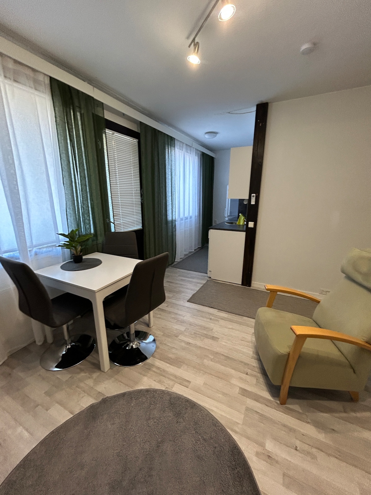 Apartmen satu bilik tidur berperabot. Tasik 400m . No beach of its own.Fishing, sledding.hunting. Ketenangan alam semula jadi. Kemungkinan tab mandi air panas. Pintu masuk sendiri. Sauna tersedia dengan pintu masuk persendirian. Mesin basuh dan pengering turut disediakan. Sauna luar juga boleh digunakan. Jarak dari bandar kira-kira 35 km. Peluang yang sangat baik untuk menaiki kereta salji dan memancing ais. Memburu di tanah negeri (Dibenarkan). Netflix tersedia. Air paip bagus dan boleh diminum. Wifi.