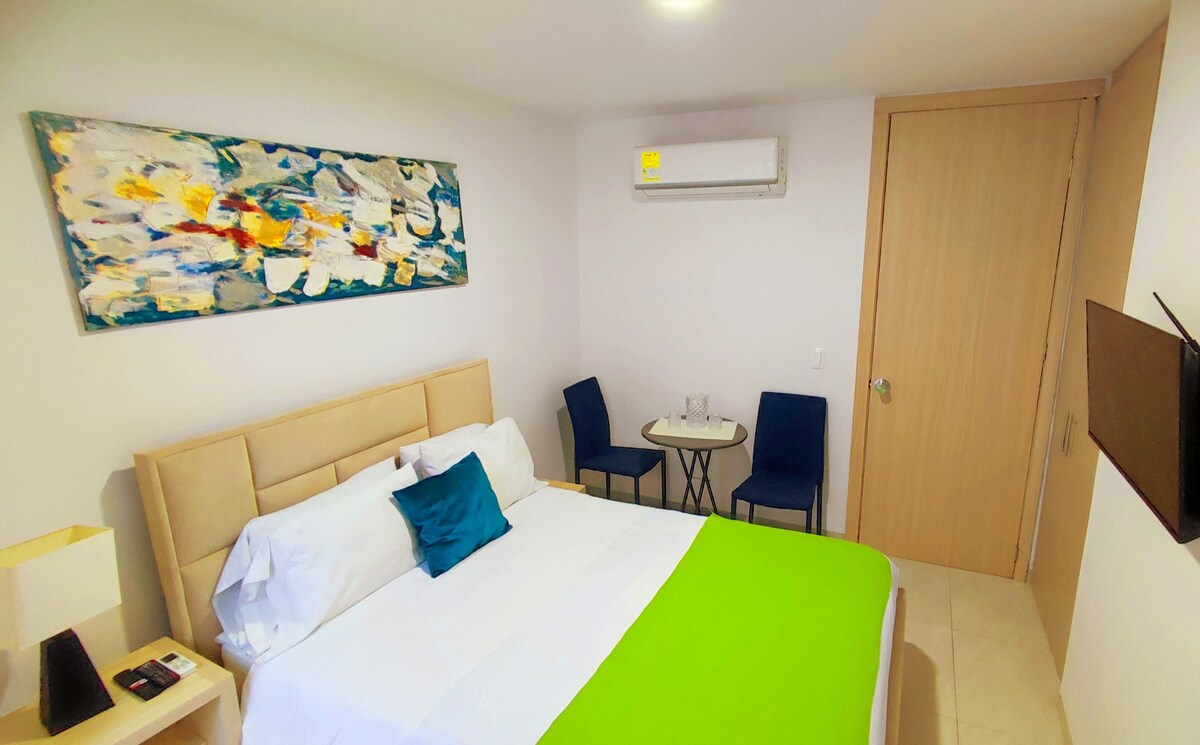 accomaje boutique belleo apartment studio small with bathroom, private kitchen, stove, microwave, fridge minibar, blender equipped utensils needed for a good stay. Inside room double bed 2 people aircond smart TV, free wifi building with coworking area, Gym we are in the north barranquilla, quiet safe, nearby parks for physical activity, close to shopping mall, restaurants, pharmacies and more distraction! interior not view is interior , sempurna, autonomous,