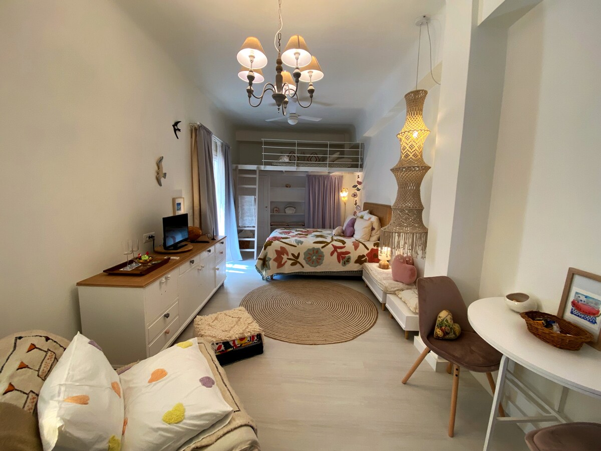 Studio mesra di pusat Ermoupolis, 2' dari pelabuhan. Ia terletak 250m dari Syros KTEL, di mana anda mempunyai akses ke pantai pulau dan 450m dari Dataran Miaouli (pangkat teksi), sesuai untuk mereka yang tidak akan memilih untuk membawa/menyewa kenderaan. Ia sesuai untuk tetamu yang ingin berada di tengah-tengah pulau, berhampiran dengan pelbagai tempat makan.