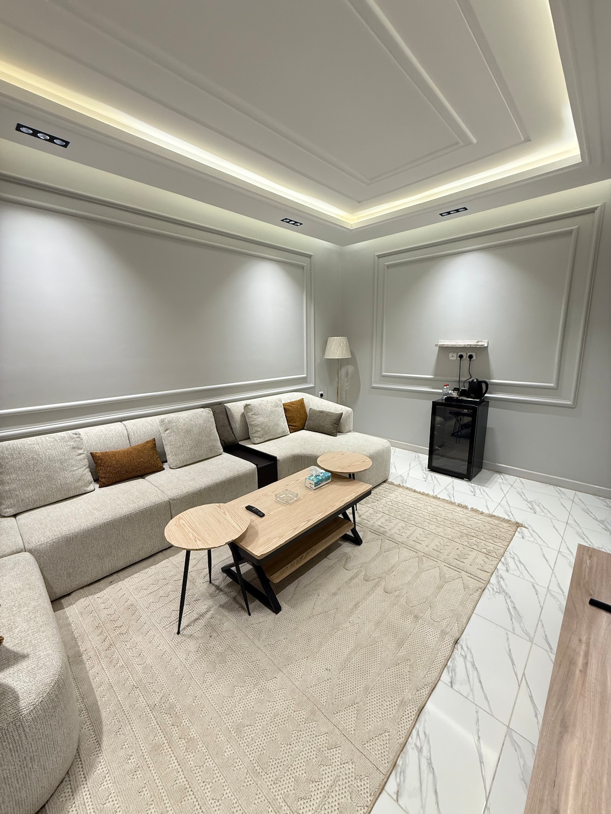 Apartmen unik ini terletak di salah satu kejiranan mewah Tabuk, yang terkenal dengan lokasi yang tenang dan strategik, kerana ia terletak kira-kira 15 minit dengan kereta dari Lapangan Terbang Prince Sultan Bin Abdulaziz, empat kilometer dari Park Mall (pusat membeli-belah terbesar di rantau ini) dan sangat dekat dengan perkhidmatan (restoran, pasar raya, dll.). 178 km dari Lapangan Terbang Neom Bay. Keselesaan, ketenangan dan kemewahan di satu tempat Kemasukan Pintar Luaran Dalaman Dari minit pertama anda berasa selesa seperti di rumah Bersepadu dan tersendiri Dapur bersepadu Rak Kopi Tumbuhan semula jadi dalaman Mesin basuh dengan pengering haba