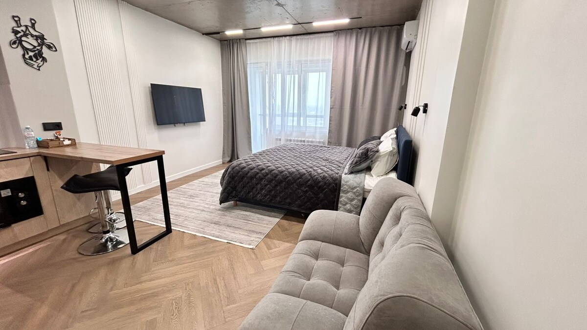 Berseronok di tempat kami yang selesa dan bergaya. Studio moden dan berfungsi di bandar Almaty untuk 2-4 orang. Mesra bayi dan kanak-kanak. Seluruh kediaman yang baru diperbaharui mempunyai semua yang diperlukan untuk penginapan mudah anda. Apartmen ini mempunyai dapur yang lengkap, Wi-Fi dan semua kemudahan yang diperlukan. Apartmen ini terletak bersebelahan dengan pusat membeli-belah besar dengan pelbagai restoran, kafe, dengan pasar raya. Jalan utama City Walking adalah dalam 10 minit dengan berjalan kaki.
