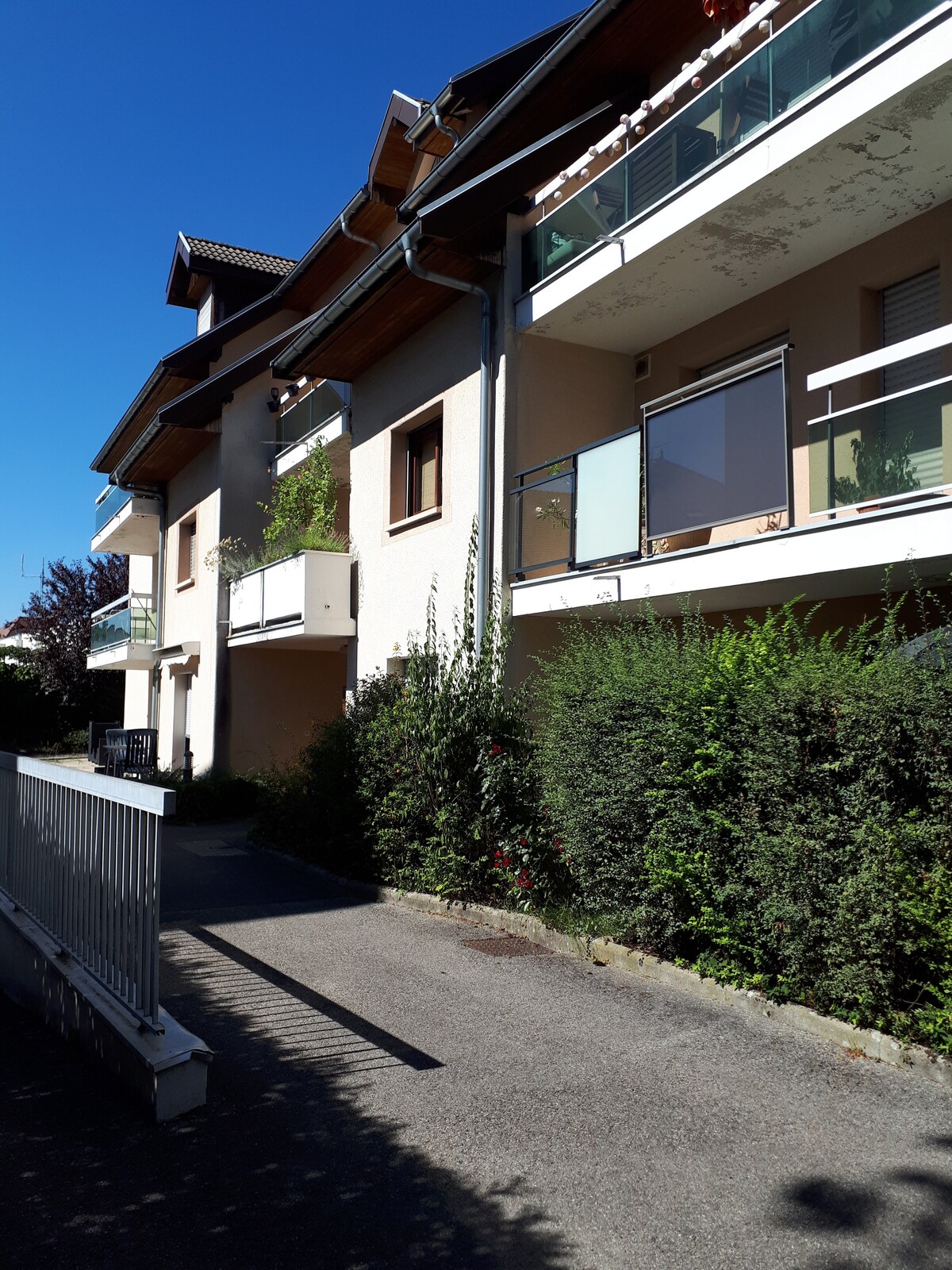 apartmen studio yang terletak di bangunan 2 tingkat kecil, di tingkat 1, 15 minit berjalan kaki dari tasik dan bandar lama, 5 minit memandu dari tasik alamat: Rue de la Fraternité apartmen dalam keadaan sangat baik, garaj tersedia termasuk dalam harga sewaan stesen pengecasan kenderaan elektrik tersedia di hadapan studio. Studio dengan katil double, dapur yang serba lengkap, mesin basuh, pembuat kopi nespresso, pinggan mangkuk Balkoni dengan meja, kerusi, untuk makan tengah hari di luar