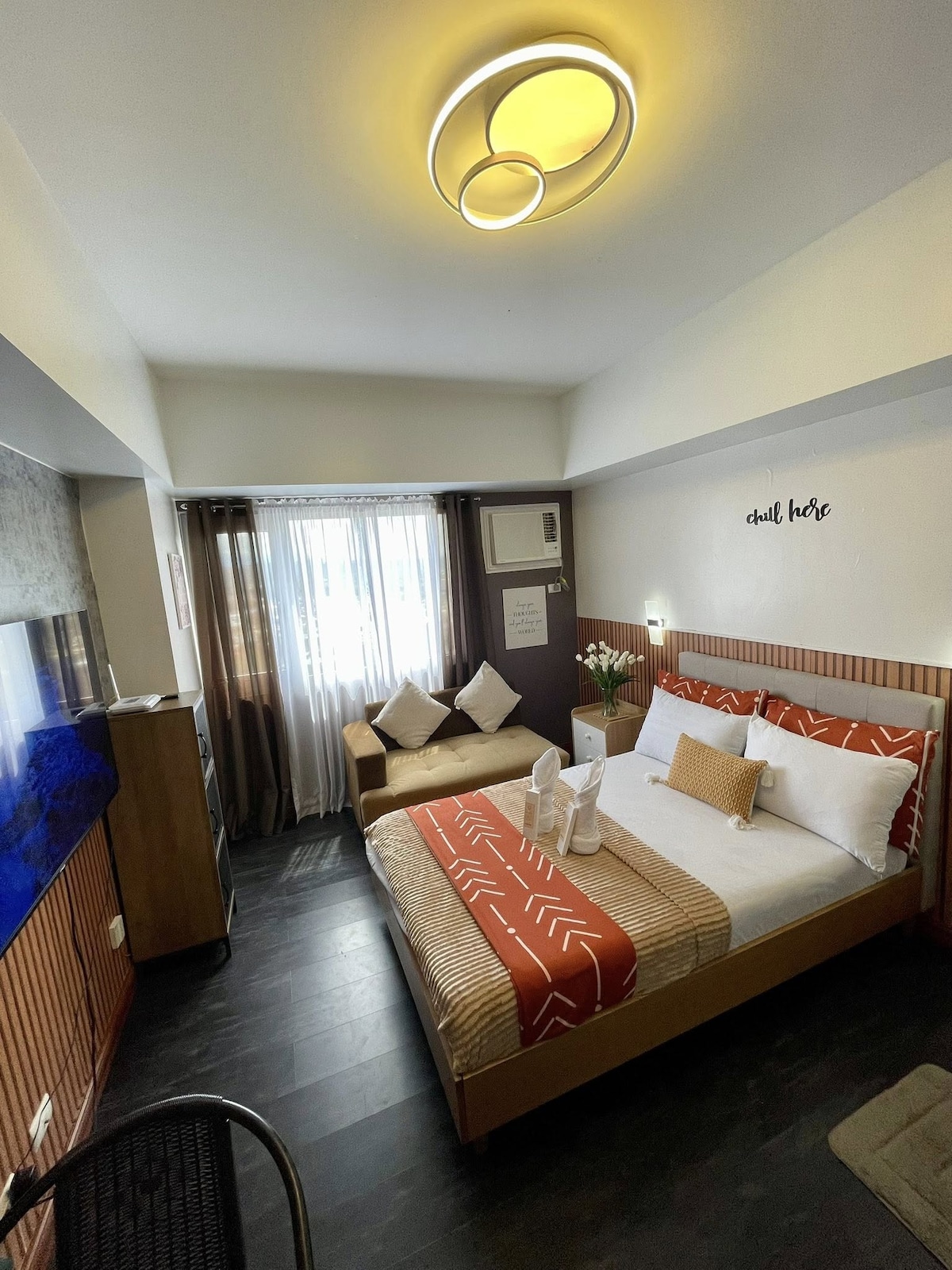 Unit kondominium jenis studio (32.5sqm) di tengah-tengah Davao City, tempat berpagar dan dijaga 24 jam. Bangunan 1 Unit 101Q terletak di Tingkat 1. Jika ANDA MENEMPAH UNIT: anda dikehendaki menghantar ID Pengenalan anda melalui e-mel kepada saya (setiap tetamu) TEMPAT LETAK kereta SPACE-ada tempat letak kereta terbuka biasa tetapi berdasarkan siapa cepat dia dapat, termasuk WIFI UNLI, dan akses Netflix. Semua peralatan di dalam unit boleh digunakan, anda hanya perlu mengendalikannya dengan berhati-hati dan menggunakannya dengan betul