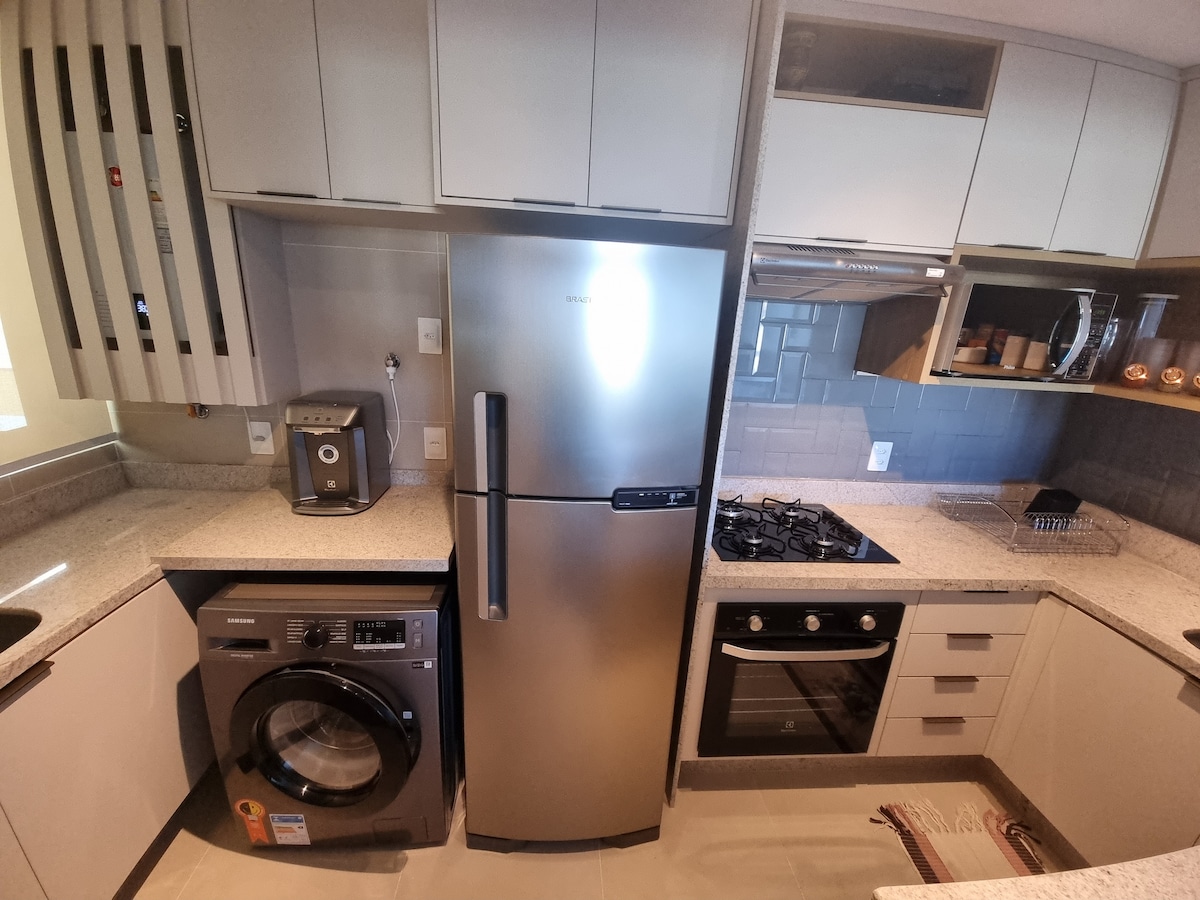🏡 Flat moden dan sangat selesa! Ruang penuh dengan 2 bilik tidur (1 katil queen, 1 katil double) dan sofa katil di ruang tamu — boleh memuatkan sehingga 6 orang dengan selesa. Dapur Amerika lengkap, bilik mandi dengan sinki batu, cadar dan tuala disertakan. Bangunan ini menakjubkan: garaj tertutup, penjaga pintu 24 jam, ruang kerja bersama, dobi dan bumbung dengan gimnasium, bilik permainan, ruang gourmet dan 4 kolam renang dengan pemandangan. ☀️ Sesuai untuk berehat, menikmati dan berasa seperti di rumah! 💛