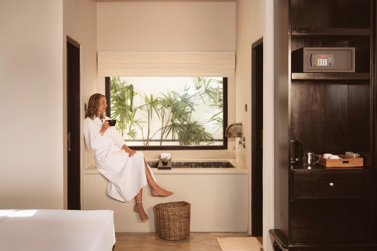 Menginap di Suite Deluxe tingkat atas kami dan bangun untuk melihat pemandangan ombak Rams barreling dari keselesaan katil anda! Nikmati matahari terbit dan matahari terbenam dari keselesaan balkoni anda sendiri, atau dari atas bumbung hotel kami. Rak tersuai daripada mahogani yang diselamatkan, perabot kayu dan fabrik yang cerah menjadikan bilik minimalis kami tempat yang selesa untuk berehat di antara pengembaraan anda.