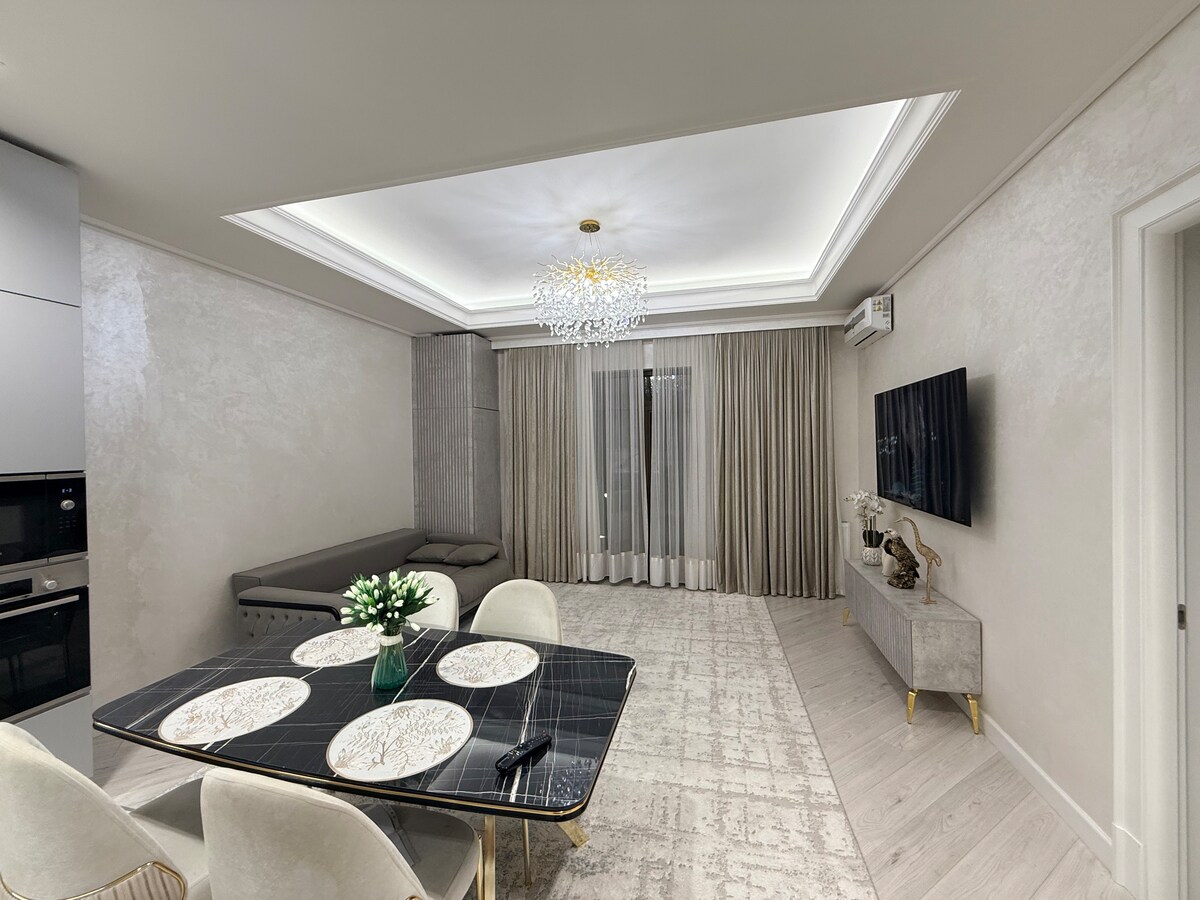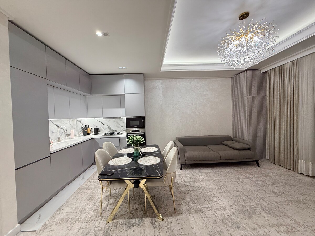 Apartmen moden di tengah-tengah Tashkent City | Kompleks kediaman Boulevard Rasai keselesaan dan gaya di apartmen 2 bilik 60m2 yang selesa ini. Bahagian dalamannya dibuat dalam nada kelabu muda yang elegan dengan butiran marmar dan pencahayaan lembut. Balkoni yang luas menghadap halaman yang tenang dengan kawasan hijau. Apartmen ✨ mempunyai semua yang anda perlukan untuk penginapan yang menakjubkan: • Dapur yang serba lengkap (peralatan Bosch terbina dalam, pinggan mangkuk, cerek, dll. • Bilik tidur yang selesa dengan katil besar dan TV