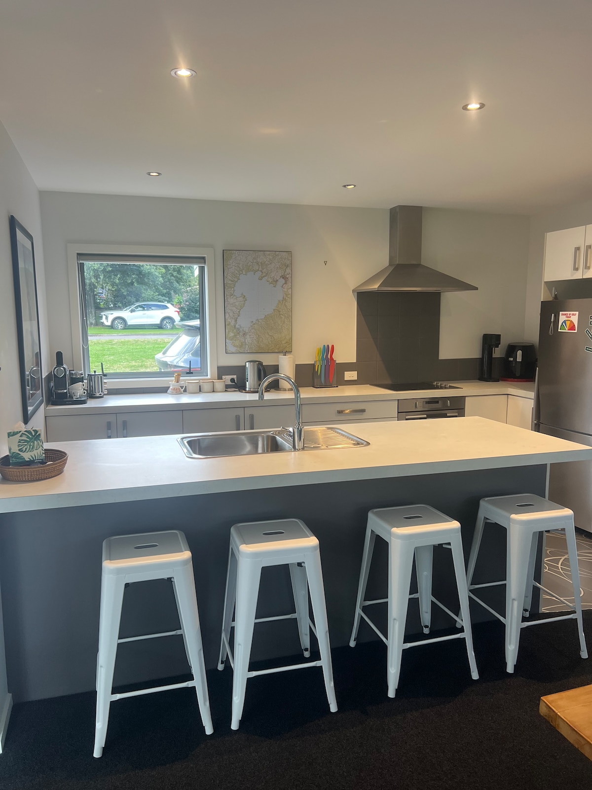 Bersantai di ruang yang tenang dan bergaya ini. Terletak di lereng bukit dengan pemandangan panorama Tasik Taupō, bandar dan pemandangan malam yang berkilauan. Ruang tamu pelan terbuka yang dipenuhi dengan cahaya semula jadi, tingkap yang luas dan pintu gelangsar membingkai pemandangan tasik yang sentiasa berubah. Pada musim panas, buka pintu untuk menyambut angin tasik; pada musim sejuk, berkumpul di sekeliling pembakar kayu yang selesa. Di luar, bahagian belakang rumah menawarkan tempat letak kereta tambahan dan lubang api luar, sesuai untuk berehat dan mengagumi pemandangan.