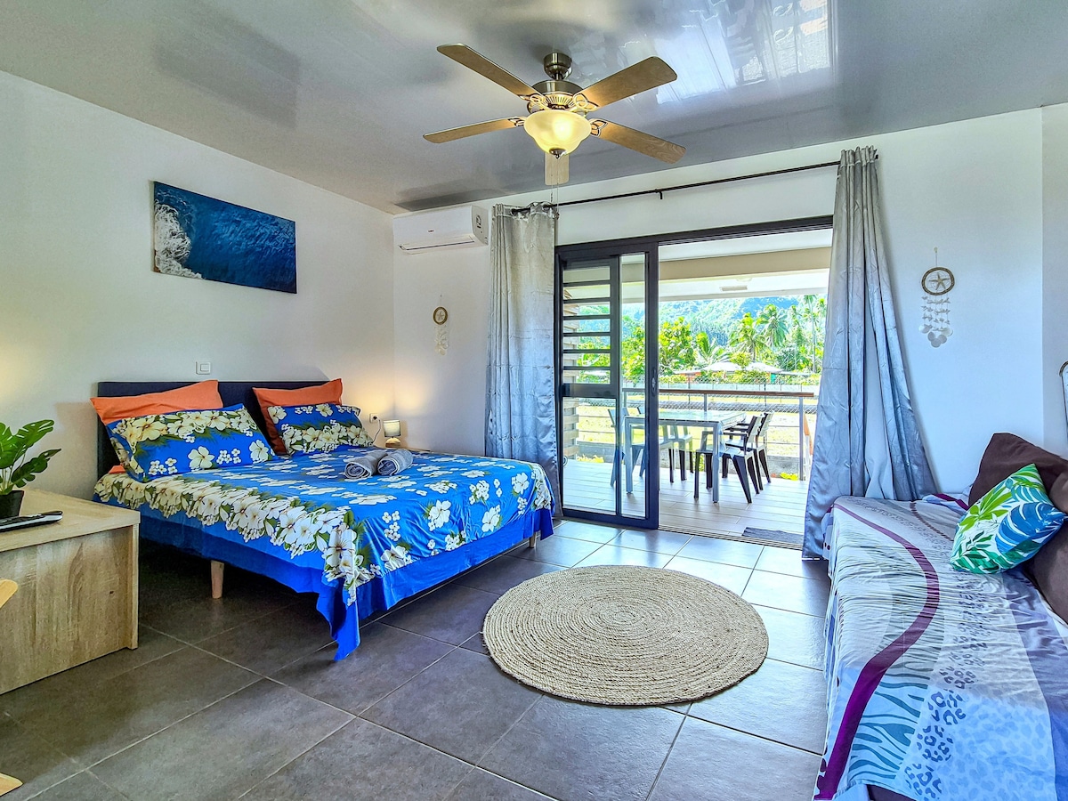 Duplex banglo di kediaman persendirian, Lapangan Terbang Antarabangsa dan antara pulau 10 minit memandu. Teres persendirian dengan pontun di lagun di mana anda boleh berenang. 2 kayak untuk berjalan-jalan dan akses ke palang pasir, 100 meter dari tambang Vaima. Di tingkat bawah, dapur lengkap +ruang makan + bilik air. Di tingkat atas, bilik +teres besar berhawa dingin dengan pemandangan Moorea yang menakjubkan dan matahari terbenam yang mewah. Pasar raya dibuka 24 jam sehari hingga 10 minit berjalan kaki.