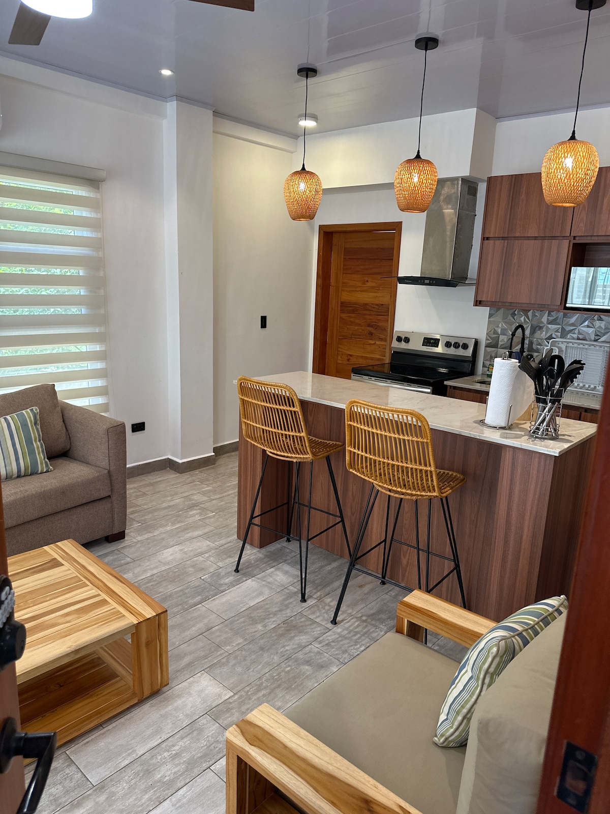 | Ruang Kami: - Apartmen dengan satu bilik dengan katil queen dan bilik mandi peribadi. Apartmen ini termasuk dapur lengkap, ruang tamu dengan TV dan sofa, dan teres persendirian. | Kemudahan: - A/C - Tempat letak kenderaan persendirian - Dapur lengkap - wifi - Ruang tamu berperabot dengan TV kabel - Teres persendirian