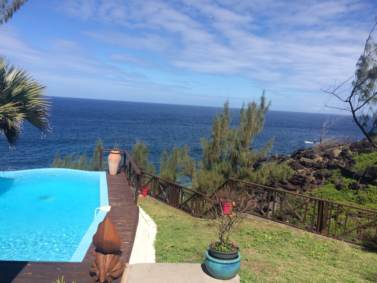 Penginapan pelancong 3 bintang yang dilengkapkan, sesuai untuk bulan madu, di Teluk Manapany yang indah, beberapa langkah dari kolam renang semula jadi. Dek besar menghadap Lautan Hindi sejauh mata memandang. Tetingkap teluk besar membolehkan anda menikmati suasana luar biasa ini dari dalam penginapan sambil mengekalkan privasi anda sepenuhnya. Reka bentuk rumah ini mewah dan unik, dengan bahan dan kemudahan berkualiti tinggi. Kopi dan teh disediakan. WiFi gentian. Soket USB.