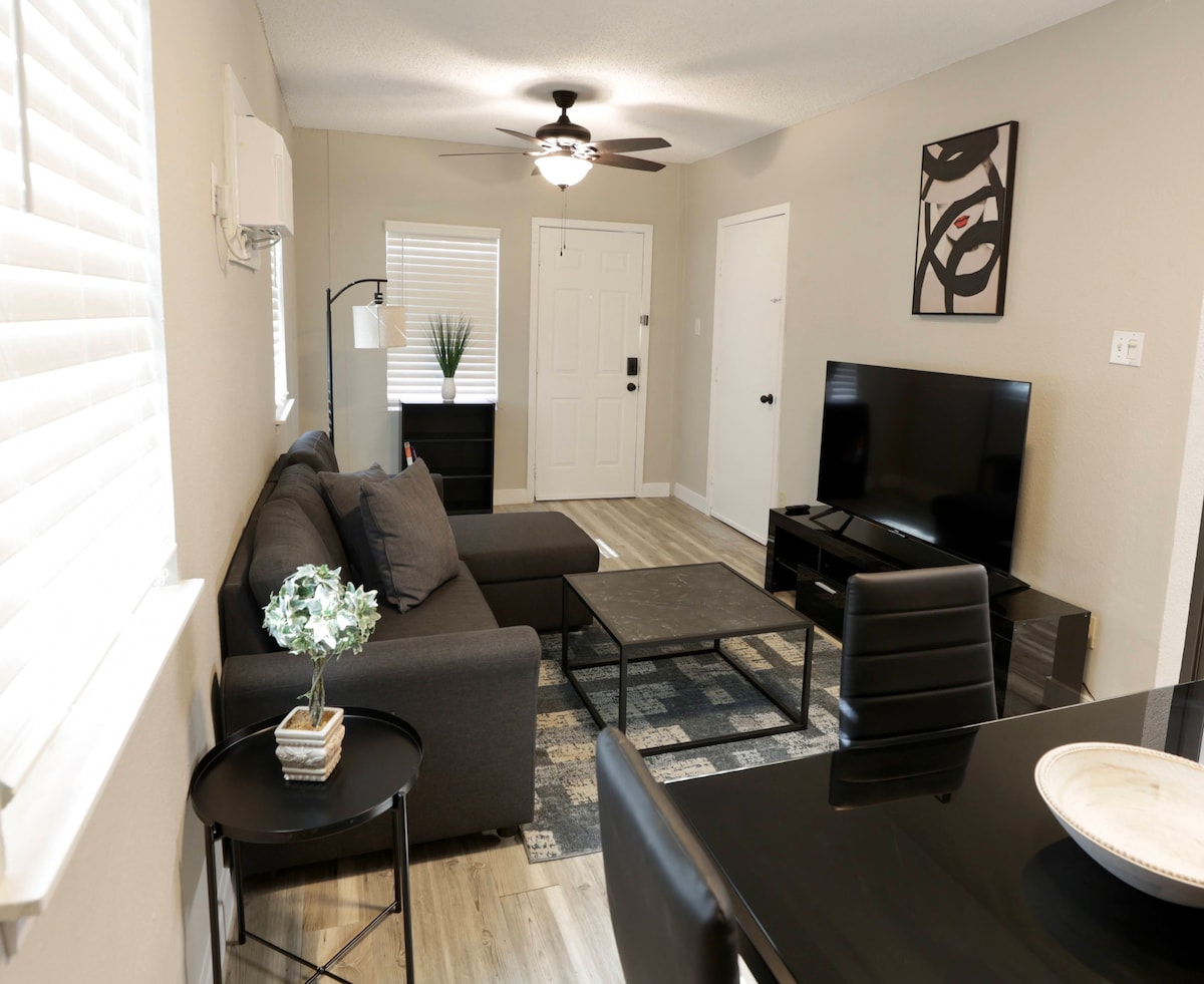 Nikmati kehidupan gaya resort di flat 2BR/2BA reka bentuk ini di San Antonio - Zenful Affirmations. Menampilkan akses berpagar, kolam renang luar yang berkilauan dan gimnasium moden, serta perabot yang selesa, apartmen ini sesuai untuk penginapan jangka panjang. Semuanya disertakan — semua utiliti, Wi-Fi laju, peralatan dapur, bekalan pembersihan, mesin basuh/pengering bersaiz penuh — jadi anda boleh menetap tanpa sebarang kesulitan. Mesra haiwan peliharaan juga! Kami Tidak Sabar Untuk Mengalu-alukan Anda Ke Afirmasi Zen!