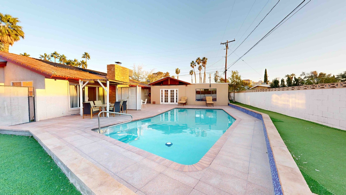 Rumah Las Vegas yang baru diubahsuai jauh dari rumah dengan oasis kolam renang resort, taman lubang api tersuai, jakuzi Clearwater moden baharu dengan lebih 100 jet dan ciri-ciri air untuk anda berehat dan menikmati, dapur luaran, kawasan patio BBQ dapur luaran, dan kawasan permainan luaran yang menyeronokkan! Rumah keluarga tunggal dengan casita ini terletak beberapa minit dari pengembaraan luar, keseronokan jalur, dan tarikan tempatan yang disayangi. Nikmati gaya Bohemia moden yang santai dengan sentuhan prihatin untuk memastikan penginapan yang selesa dan tidak dapat dilupakan.