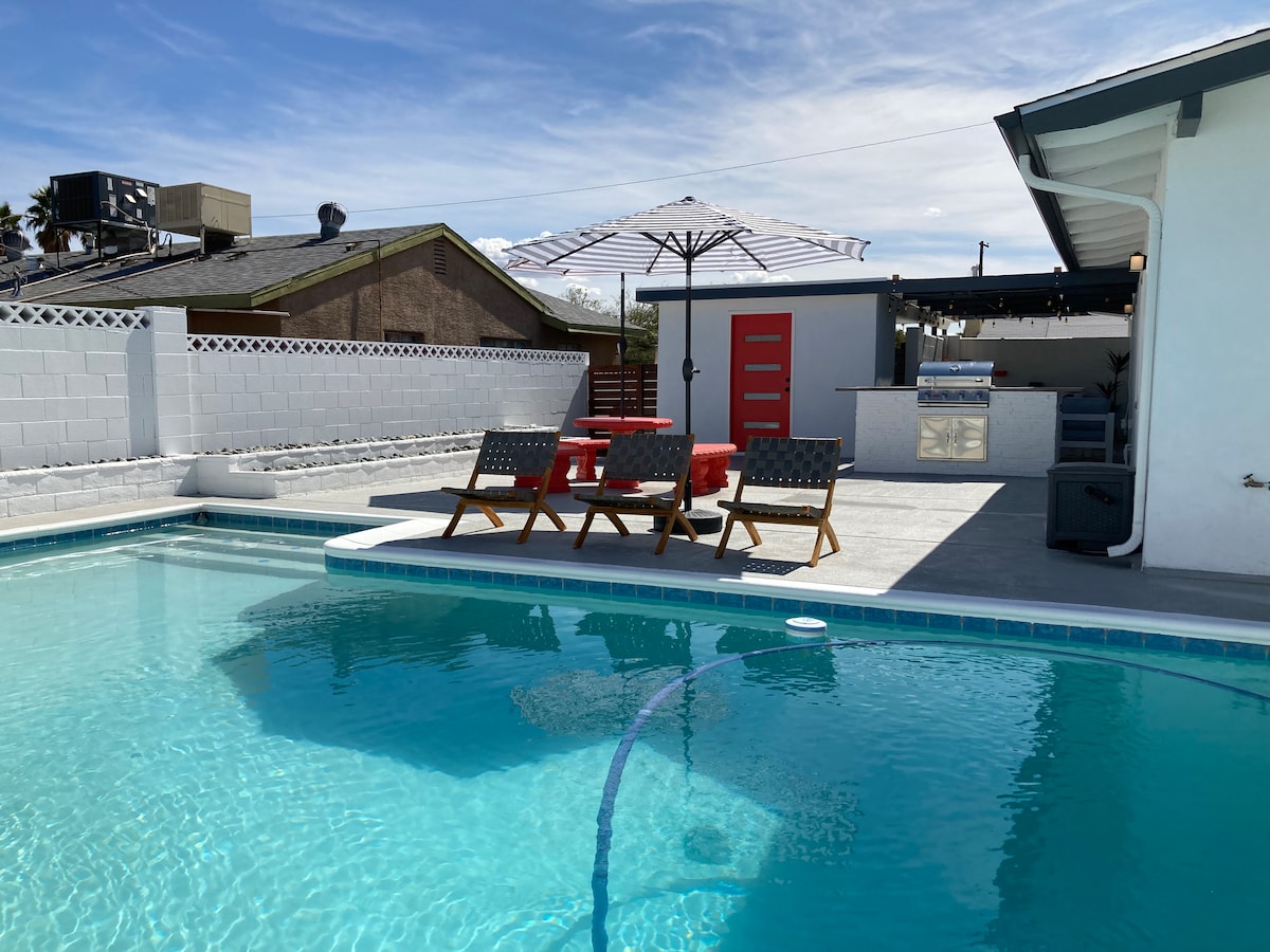 Ini adalah oasis gurun bergaya Palm Springs yang hebat untuk menikmati pengalaman Las Vegas anda! Ia mempunyai halaman belakang yang luas dilengkapi dengan kolam renang yang menakjubkan, pulau gril, dan beberapa kawasan bersantai. Nikmati rehat daripada panas padang pasir dengan berendam di kolam renang oasis peribadi anda! Terdapat kawasan pejabat dengan internet untuk kerja jarak jauh. Semua keperluan asas yang anda mungkin perlukan untuk memasak, Keurig dan kawasan dobi yang serba lengkap disediakan. Bersantai di ruang yang tenang dan bergaya ini. Lic. G71-06392