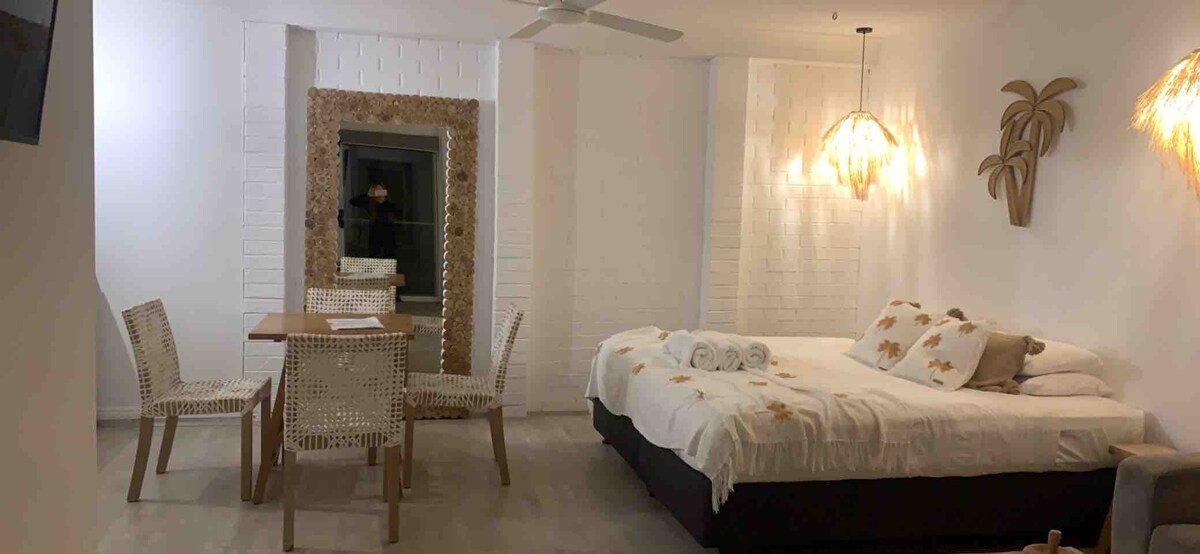 Studio baharu moden bertentangan dengan Pantai Belongil dengan 10 minit berjalan kaki ke bandar dan 3 minit berjalan kaki ke restoran dan bar Treehouse yang terkenal. Studio ini mempunyai pintu masuk berasingan daripada rumah utama. Dapur mempunyai peti sejuk penuh, plat panas, ketuhar gelombang mikro (terletak di dalam kabinet di atas peti sejuk) dan penggoreng udara. Terdapat bbq weber mini untuk kegunaan tetamu. Kabin ini mempunyai semua yang anda perlukan untuk percutian tepi laut yang indah termasuk penyaman udara dan kipas.