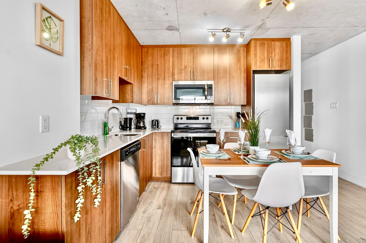 Memperkenalkan suite 1 bilik tidur kami yang bergaya, menampilkan katil mewah bersaiz king + katil sofa untuk menampung sehingga 4 tetamu. Percutian moden ini menawarkan perabot bergaya dan kemudahan mewah, memastikan penginapan yang selesa untuk kumpulan kecil atau keluarga. Dengan lokasi utamanya, suite kami menyediakan akses mudah kepada tarikan, tempat makan, dan pilihan hiburan Montreal, menjadikannya pilihan yang sempurna untuk percutian bandar anda.